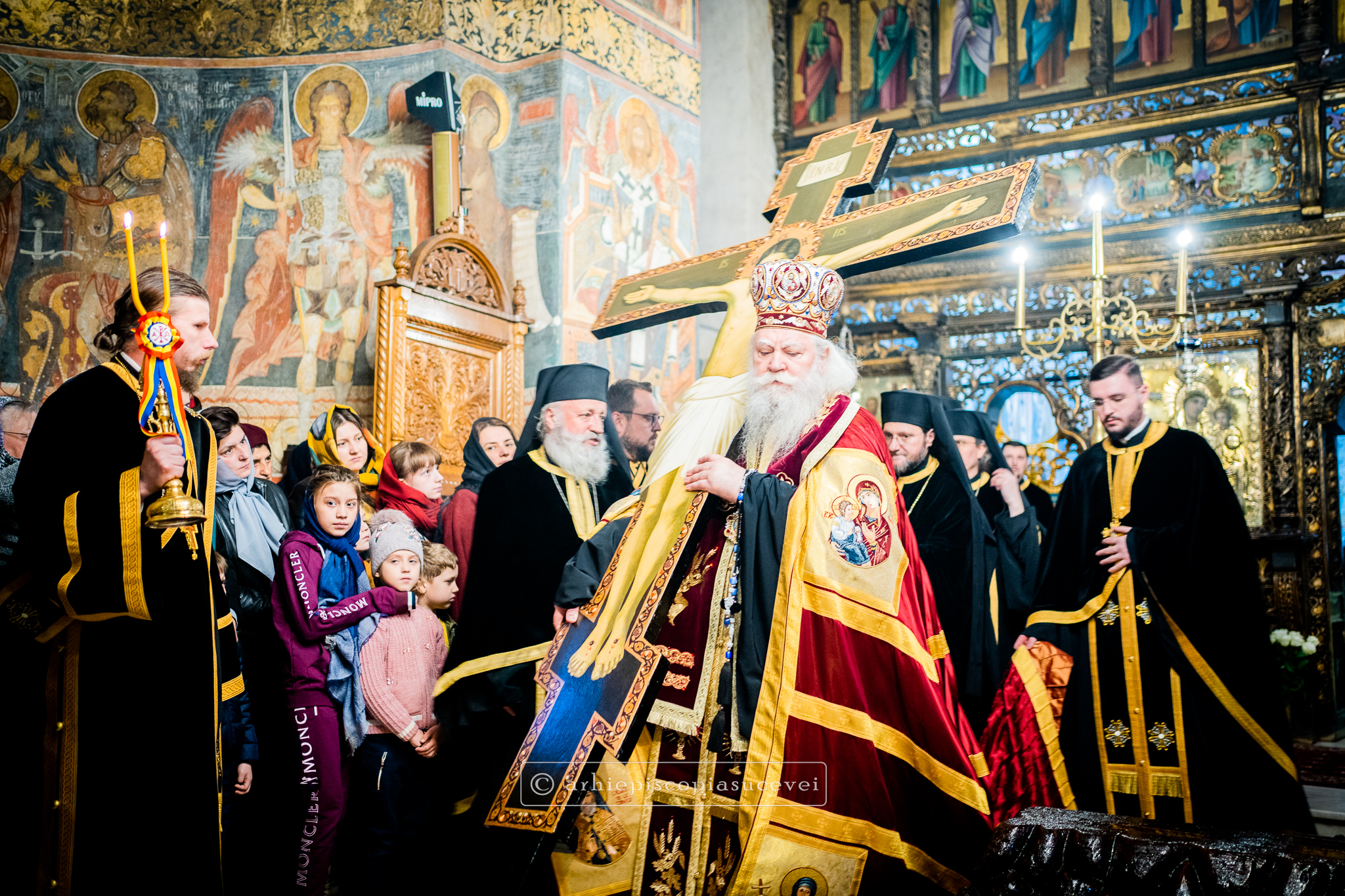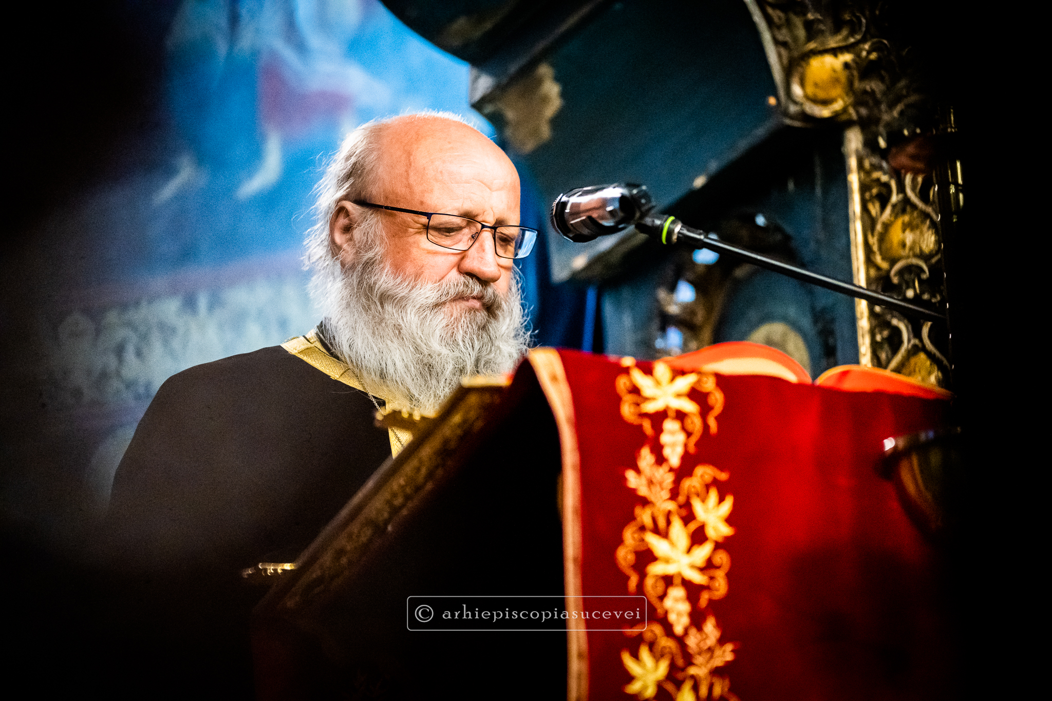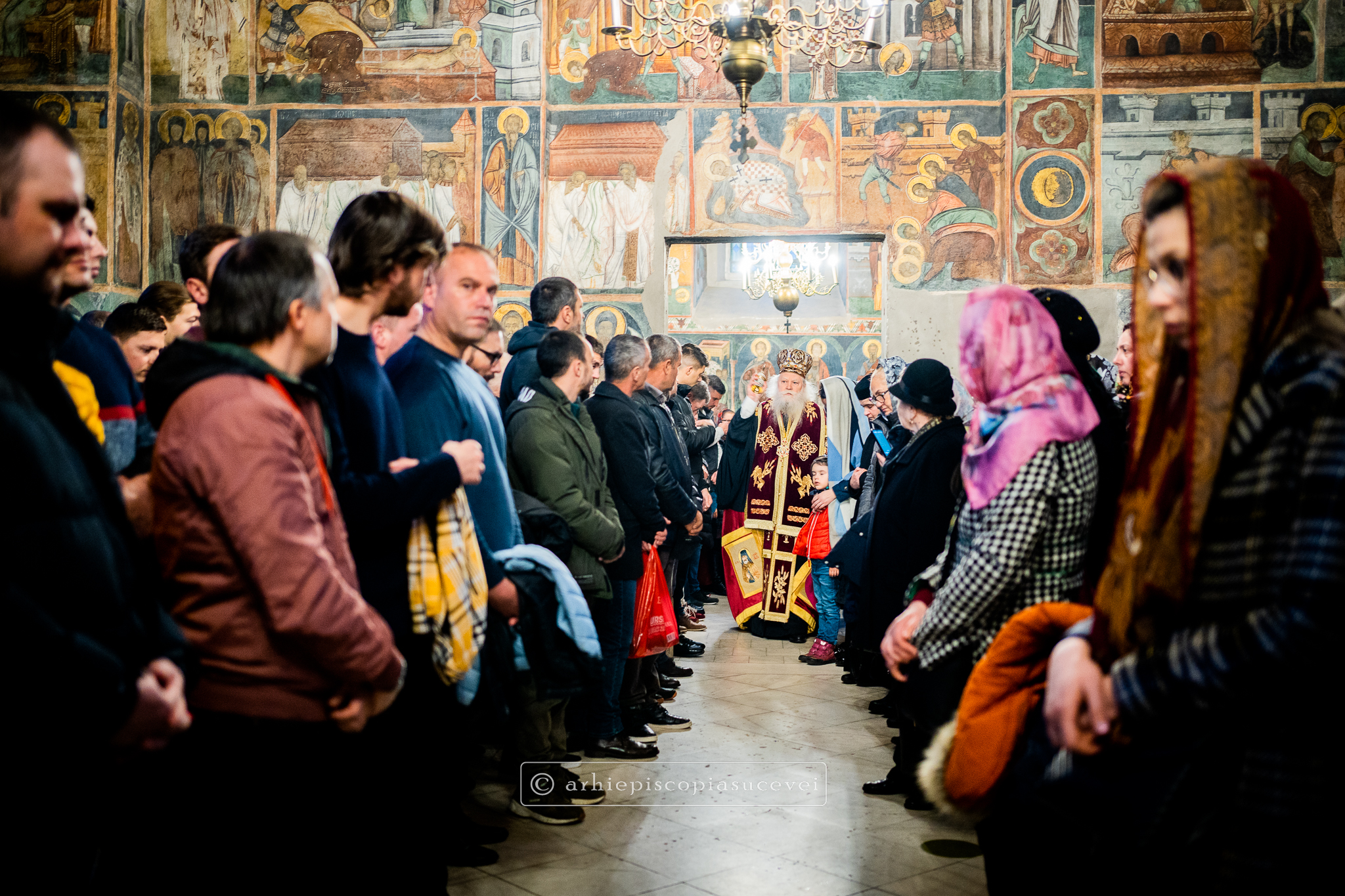 În dimineața zilei, Înaltpreasfințitul Părinte Calinic, Arhiepiscop al Sucevei și Rădăuților, a săvârșit Liturghia Sfântului Vasile cel Mare unită cu Vecernia zilei de vineri în Biserica „Sfântul Mare Mucenic Gheorghe” din cadrul așezământului monahal, înconjurat de un sobor de preoți și diaconi. Slujba oficiată în această zi este una specială, pentru că amintește de Cina cea de Taină, momentul în care Mântuitorul a instituit Sfânta Euharistie.