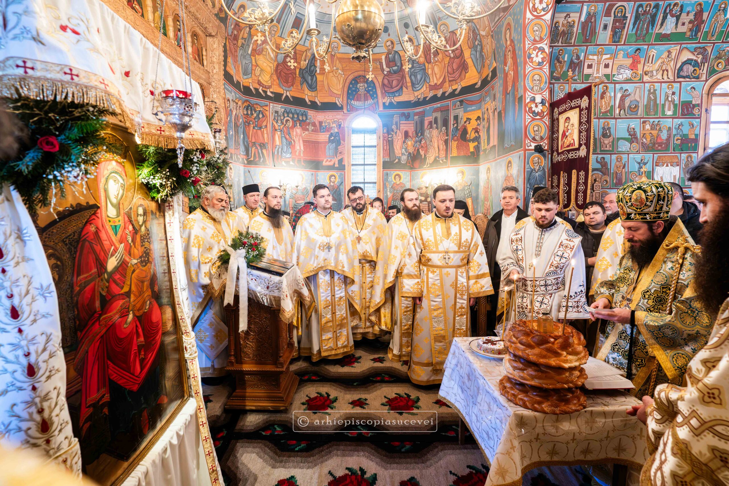După primirea cu pâine și sare, potrivit obiceiului, ierarhul s-a închinat la mormântul Sfântului Cuvios Daniil din biserica mare a mănăstirii, aflată sub ocrotirea Sfântului Mare Mucenic Gheorghe. Preasfinția Sa a săvârșit apoi Sfânta și Dumnezeiasca Liturghie în paraclisul ctitoriei voievodale, înconjurat de un sobor de preoți și diaconi, din care au făcut parte clerici de la Centrul Eparhial Suceava, între care pr. Filaret Ruscan, consilier al Sectorului Misiune Pastorală și Actualitate Creștină, precum și slujitori ai sfintelor altare de la biserici și mănăstiri din împrejurimi.