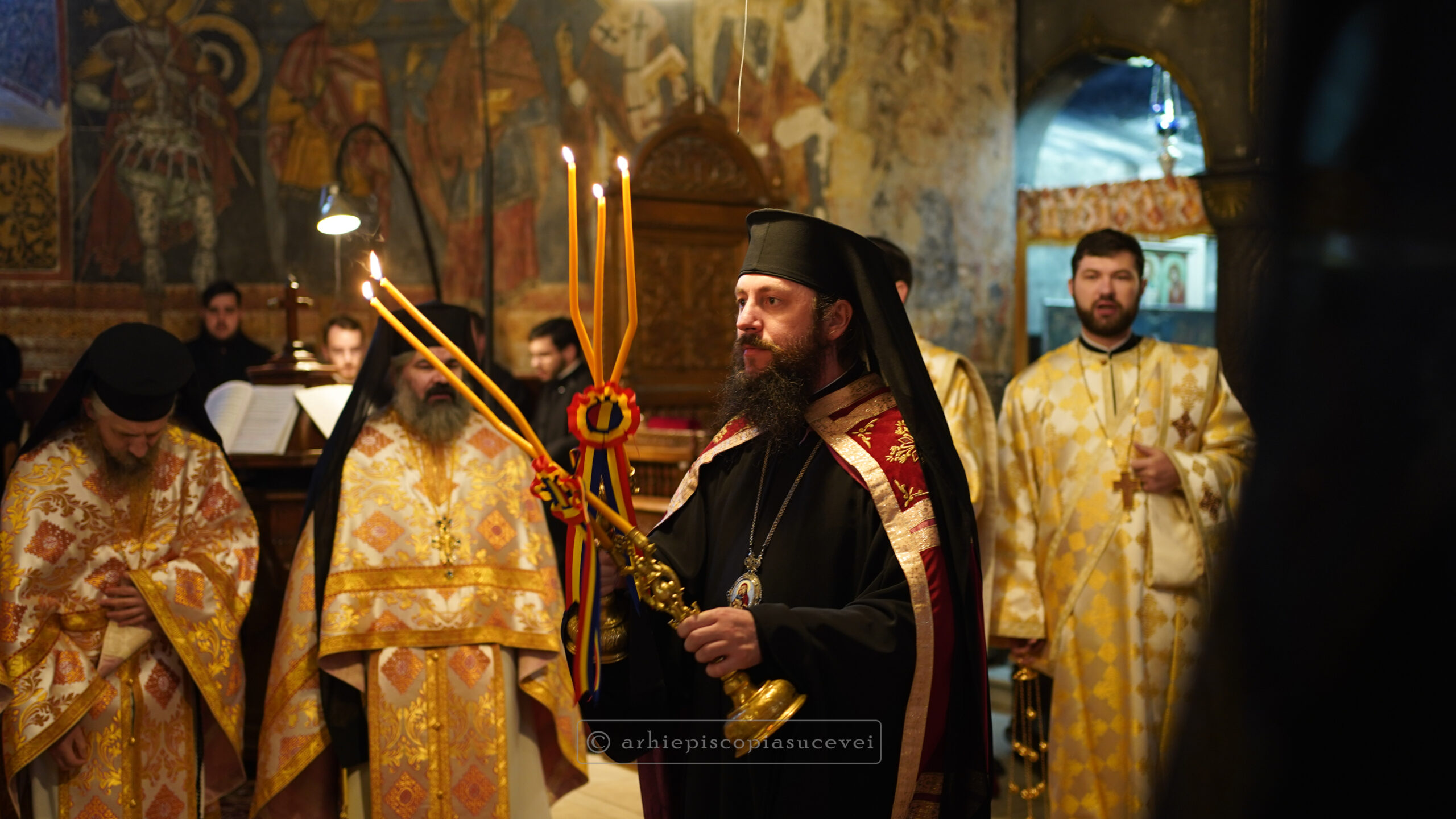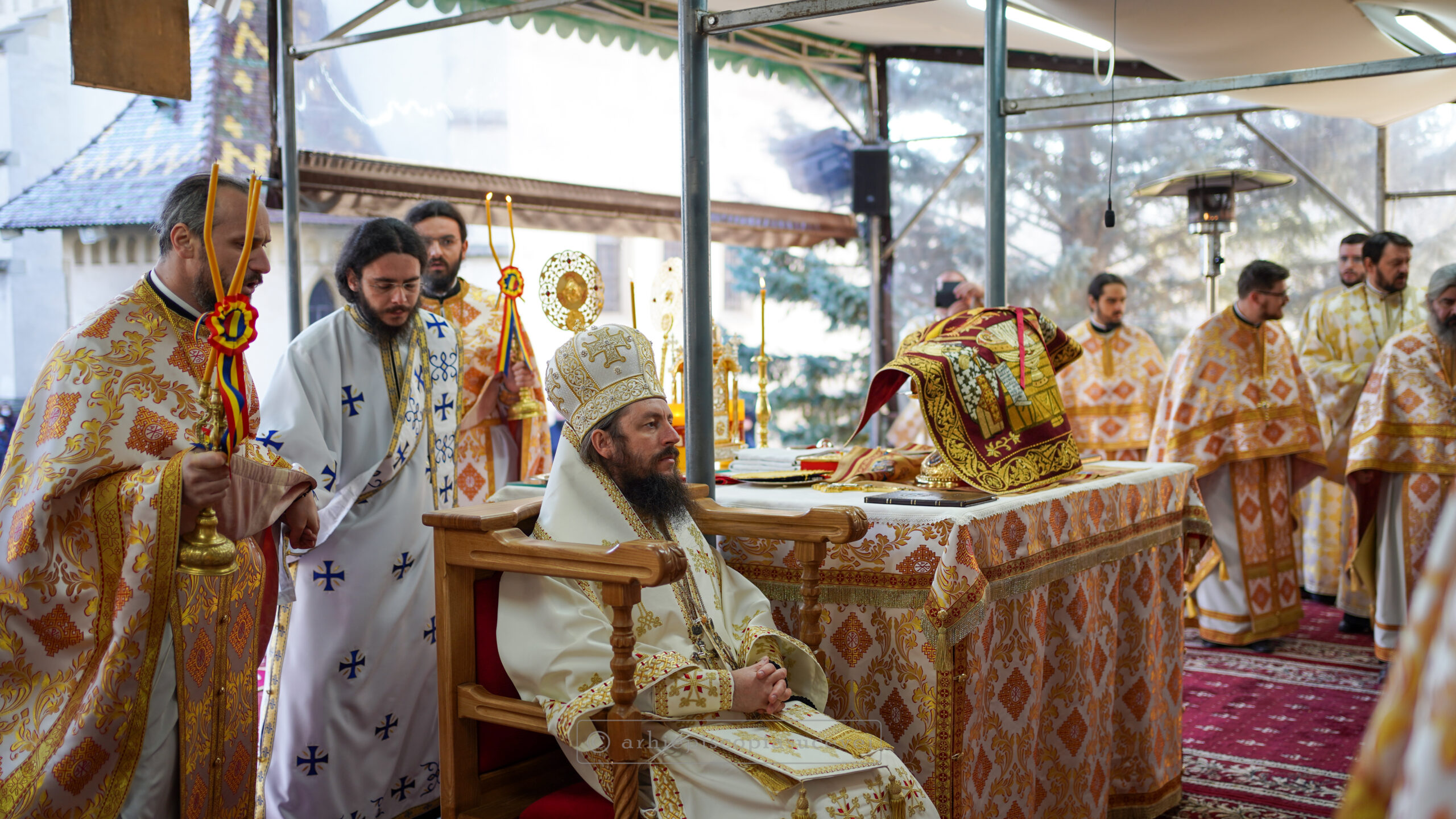 Preasfințitul Părinte Damaschin Dorneanul, Episcop-Vicar al Arhiepiscopiei Sucevei și Rădăuților, a săvârșit Sfânta și Dumnezeiasca Liturghie pe un podium special amenajat în imediata apropiere a lăcașului de cult, alături de un sobor de preoți și diaconi, format din slujitori ai mănăstirii și din clerici de la Centrul Eparhial.