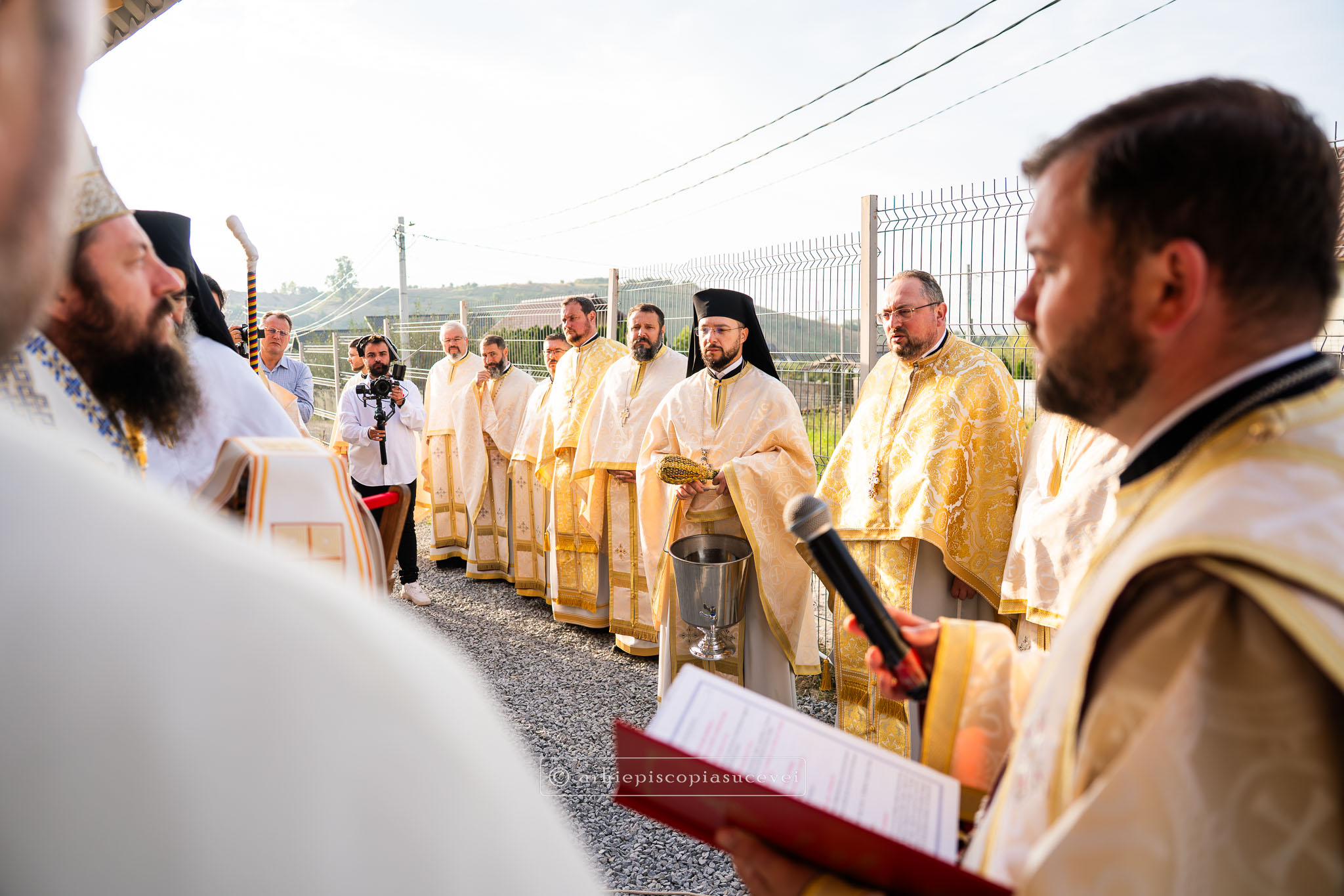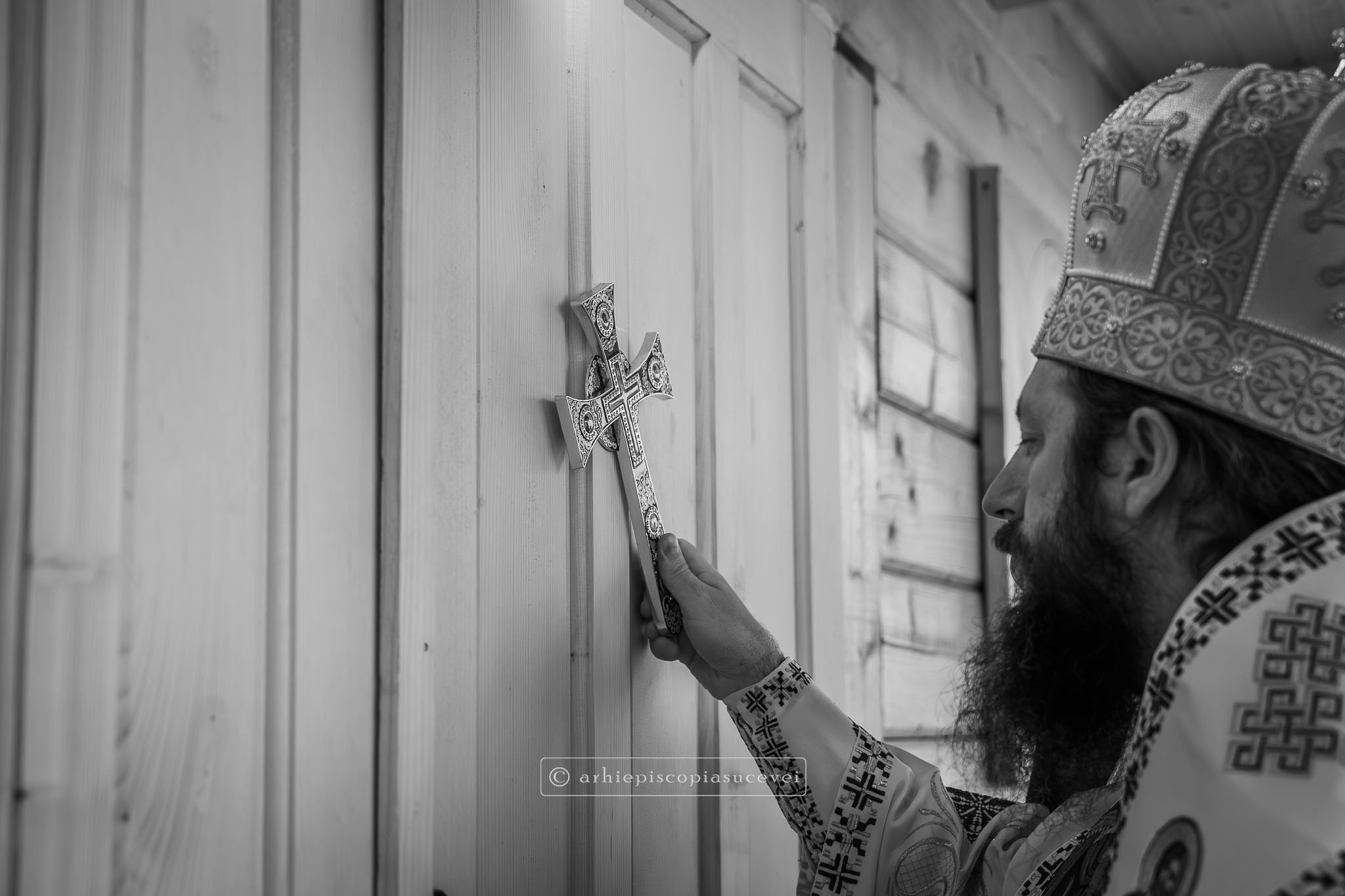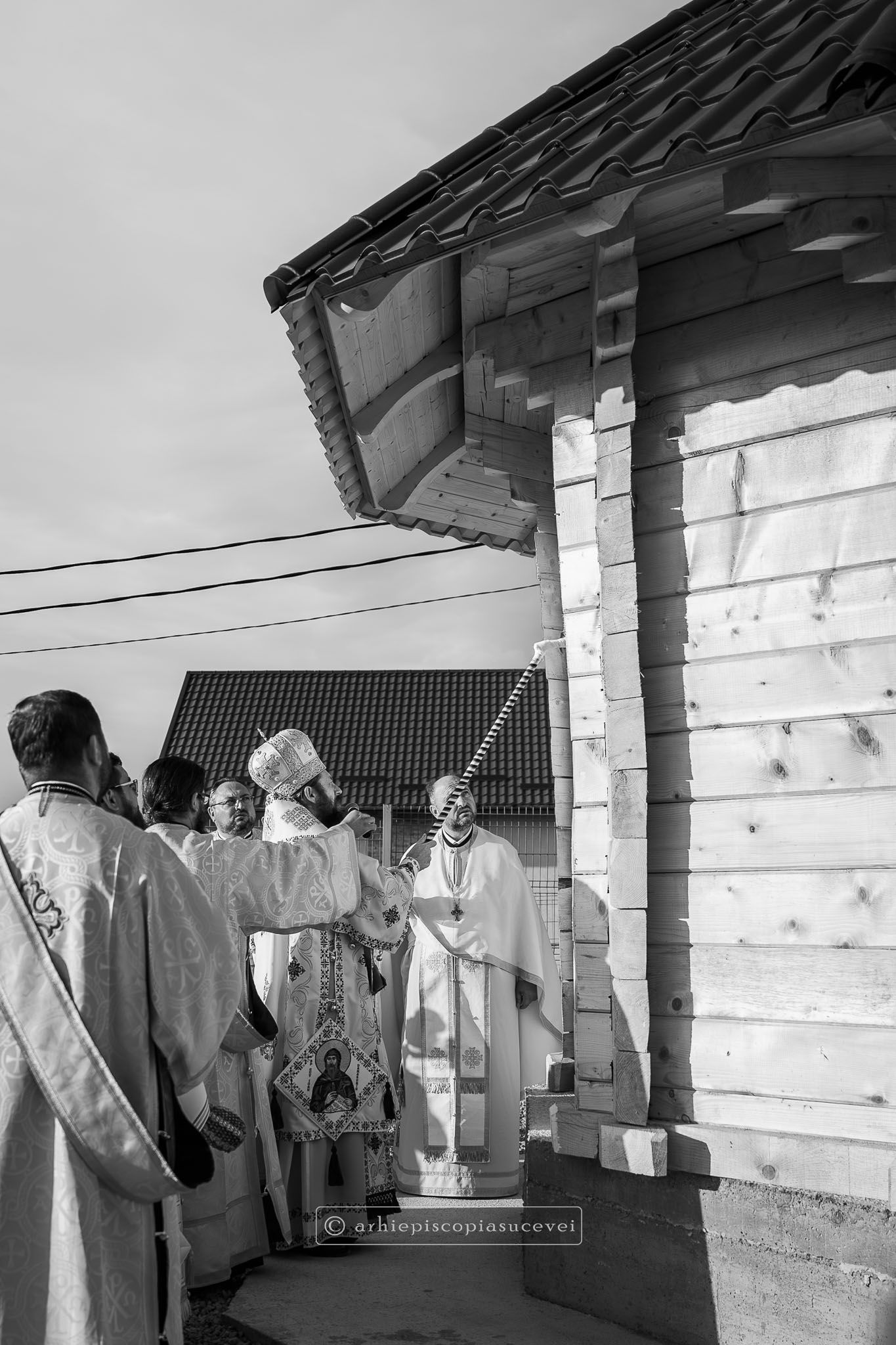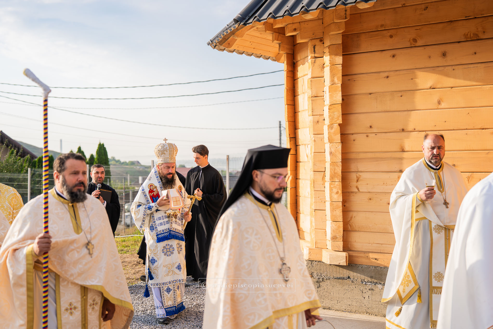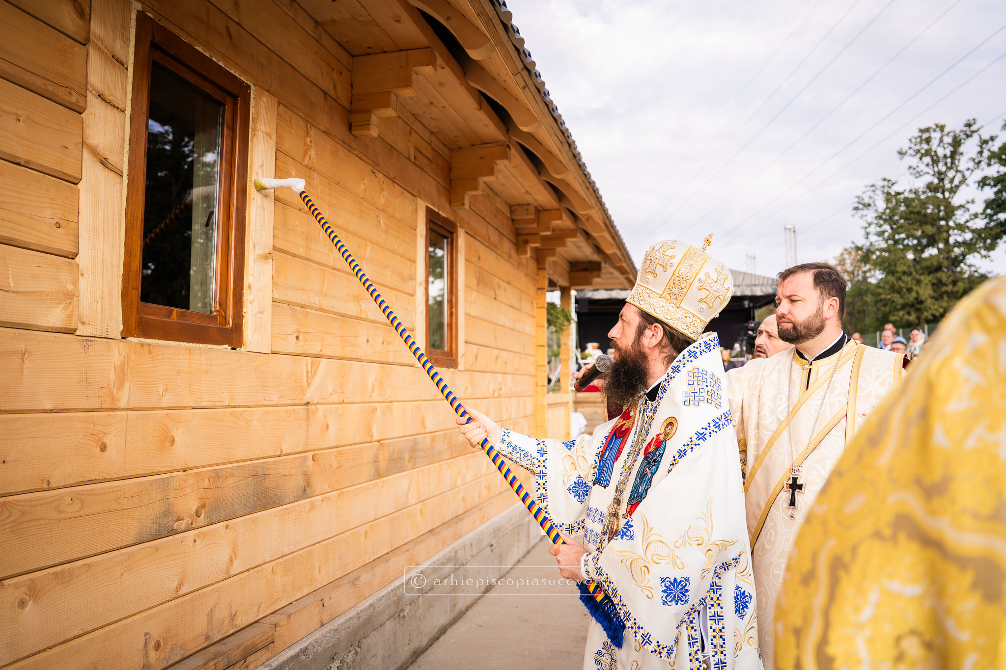 După ce a fost întâmpinat în cartierul sucevean La pădurea de stejari cu pâine și sare, potrivit obiceiului, Preasfințitul Părinte Damaschin Dorneanul a săvârșit slujba de binecuvântare a noului locaș de cult, înveșmântat astfel în lumină și har cu voia Tatălui, cu ajutorul Fiului și cu săvârșirea Sfântului Duh.
