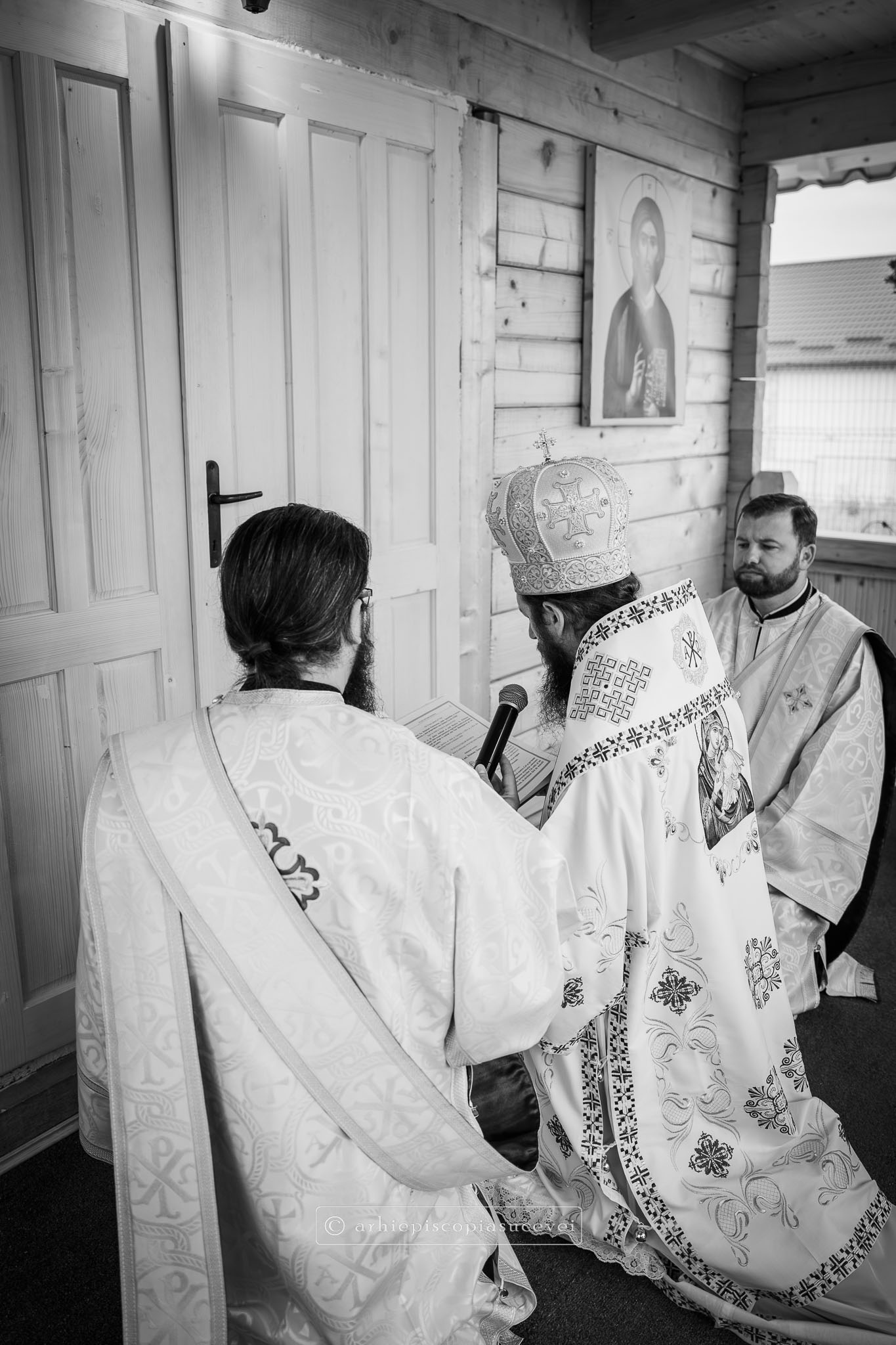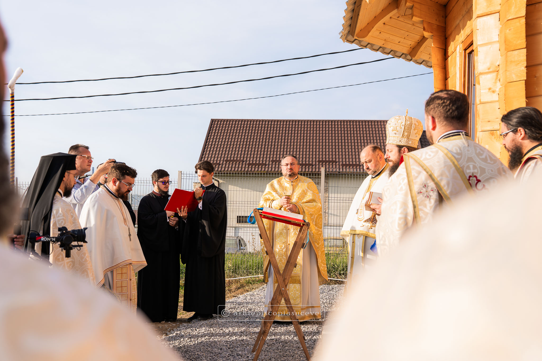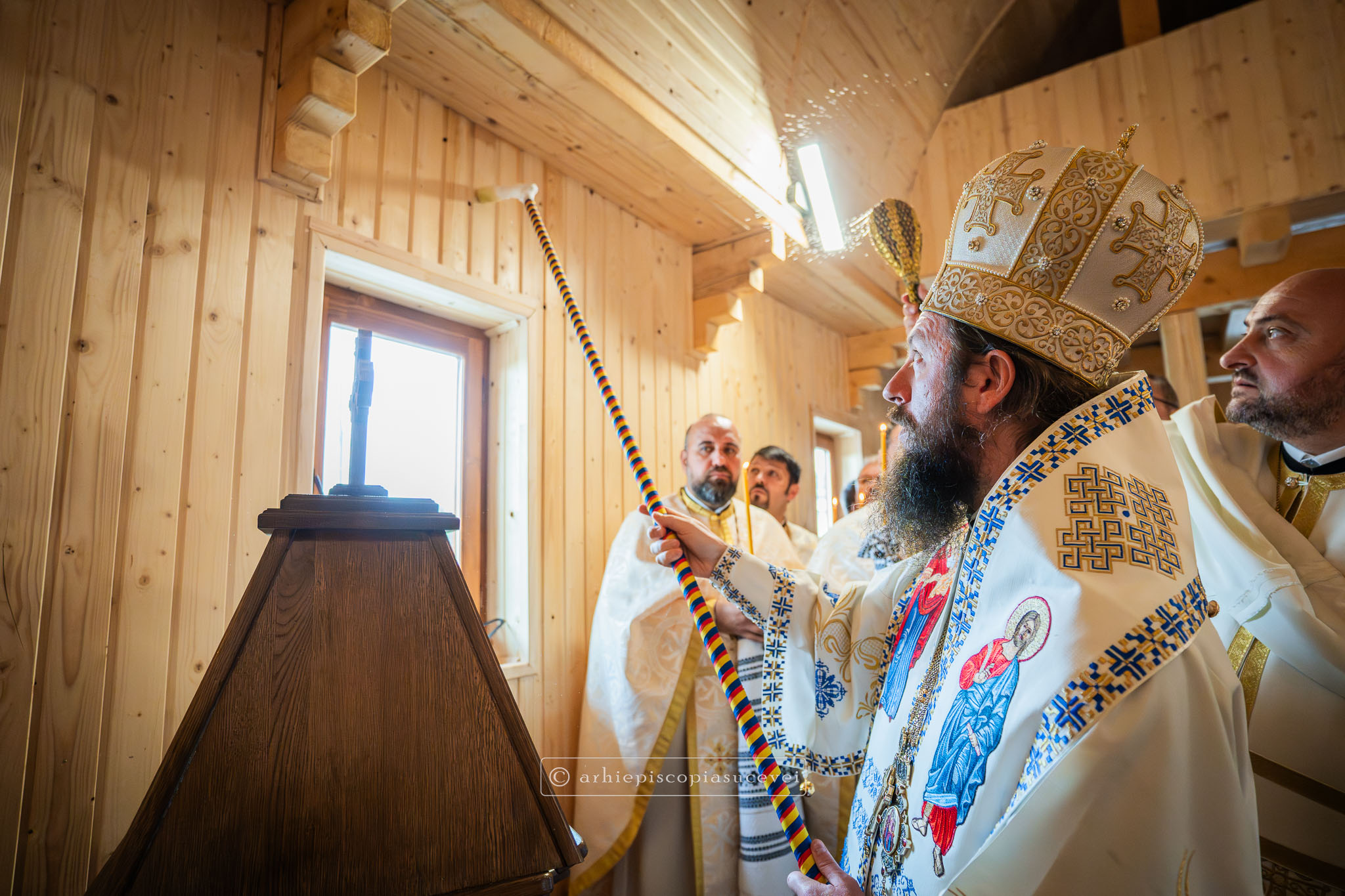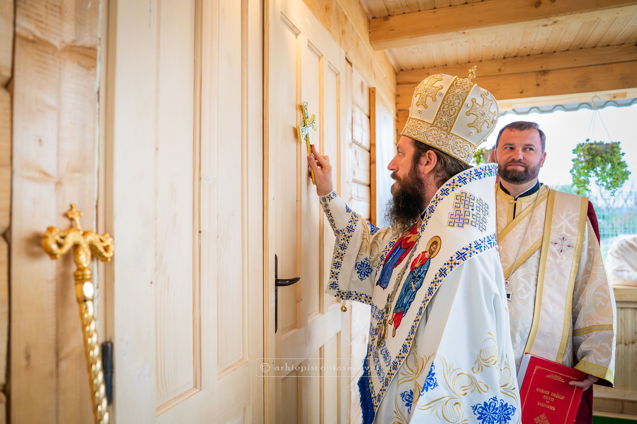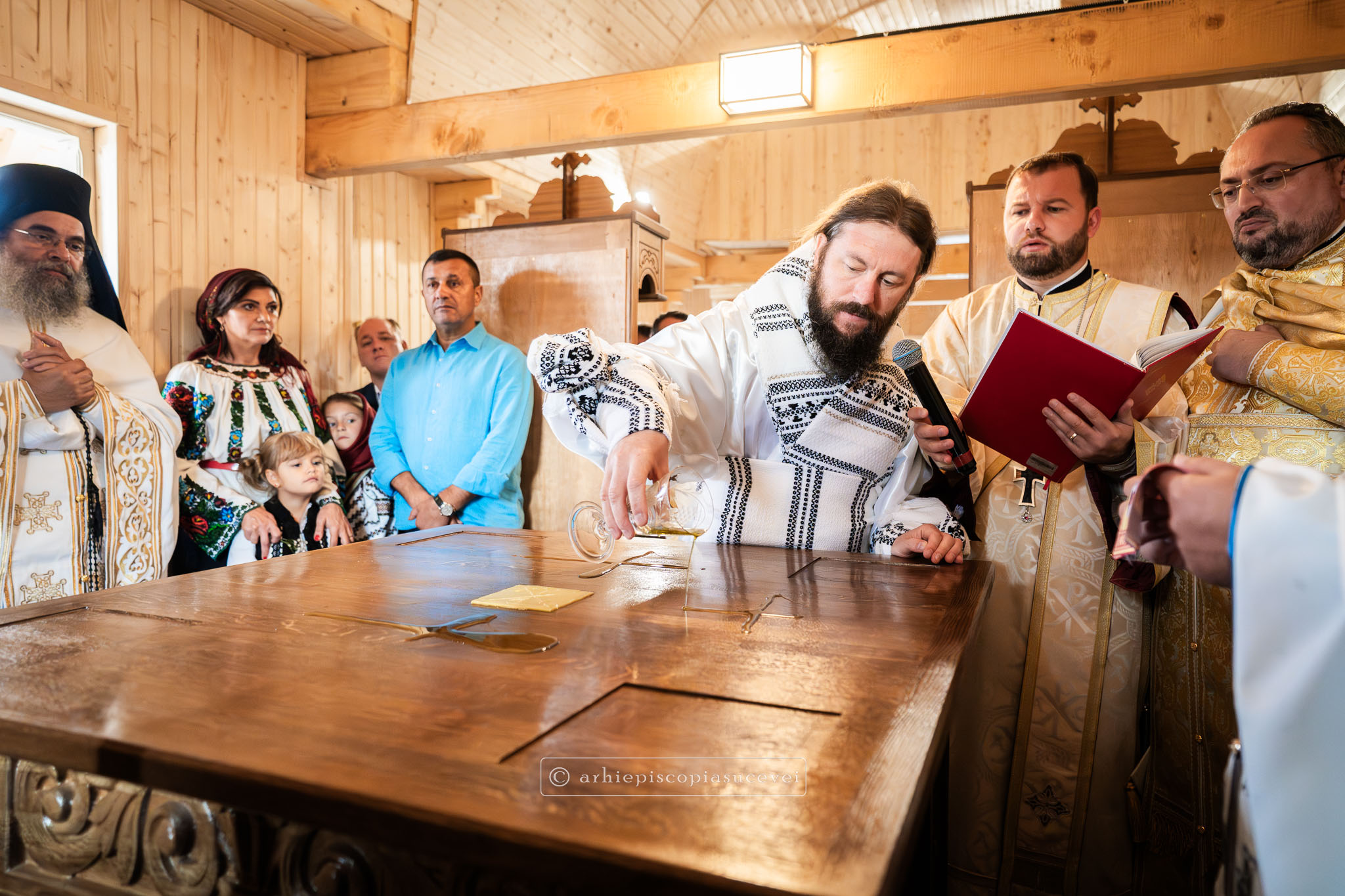 Slujba de târnosire a început cu invocarea harului Preasfintei Treimi în fața ușilor închise ale bisericuței din lemn, aceasta fiind mai apoi înconjurată de soborul slujitor, făcându-se trei opriri, pentru a o binecuvânta prin stropire cu apă sfințită și prin însemnarea în chipul Sfintei Cruci cu Sfântul și Marele Mir. Preasfinția Sa a pecetluit apoi masa Sfântului Altar și a sfințit interiorul bisericii, potrivit rânduielilor liturgice.