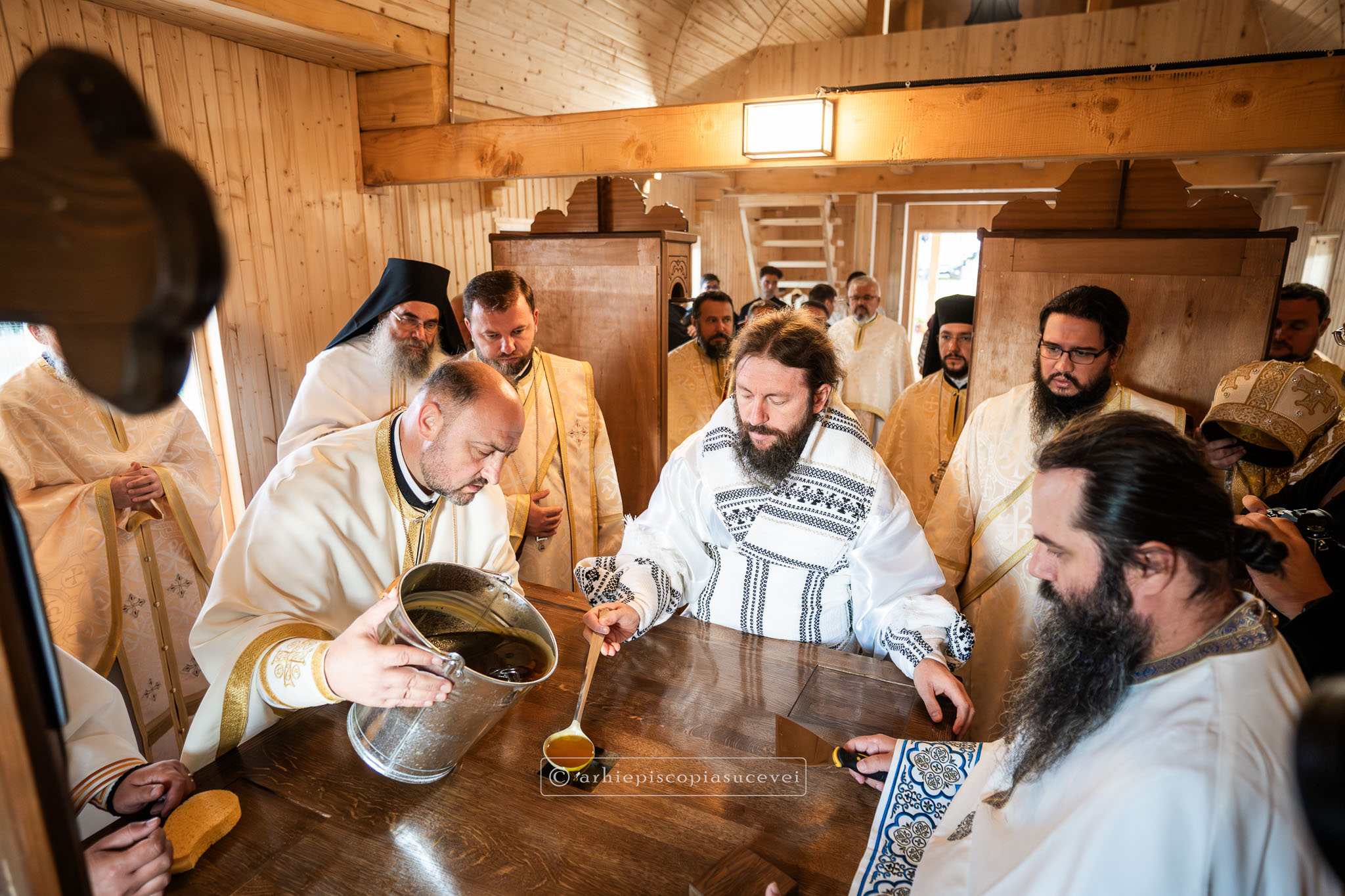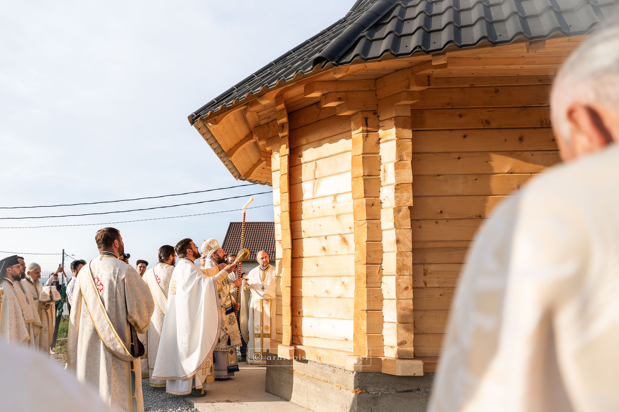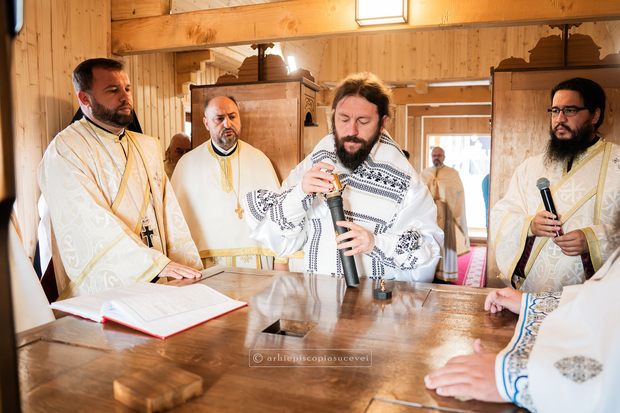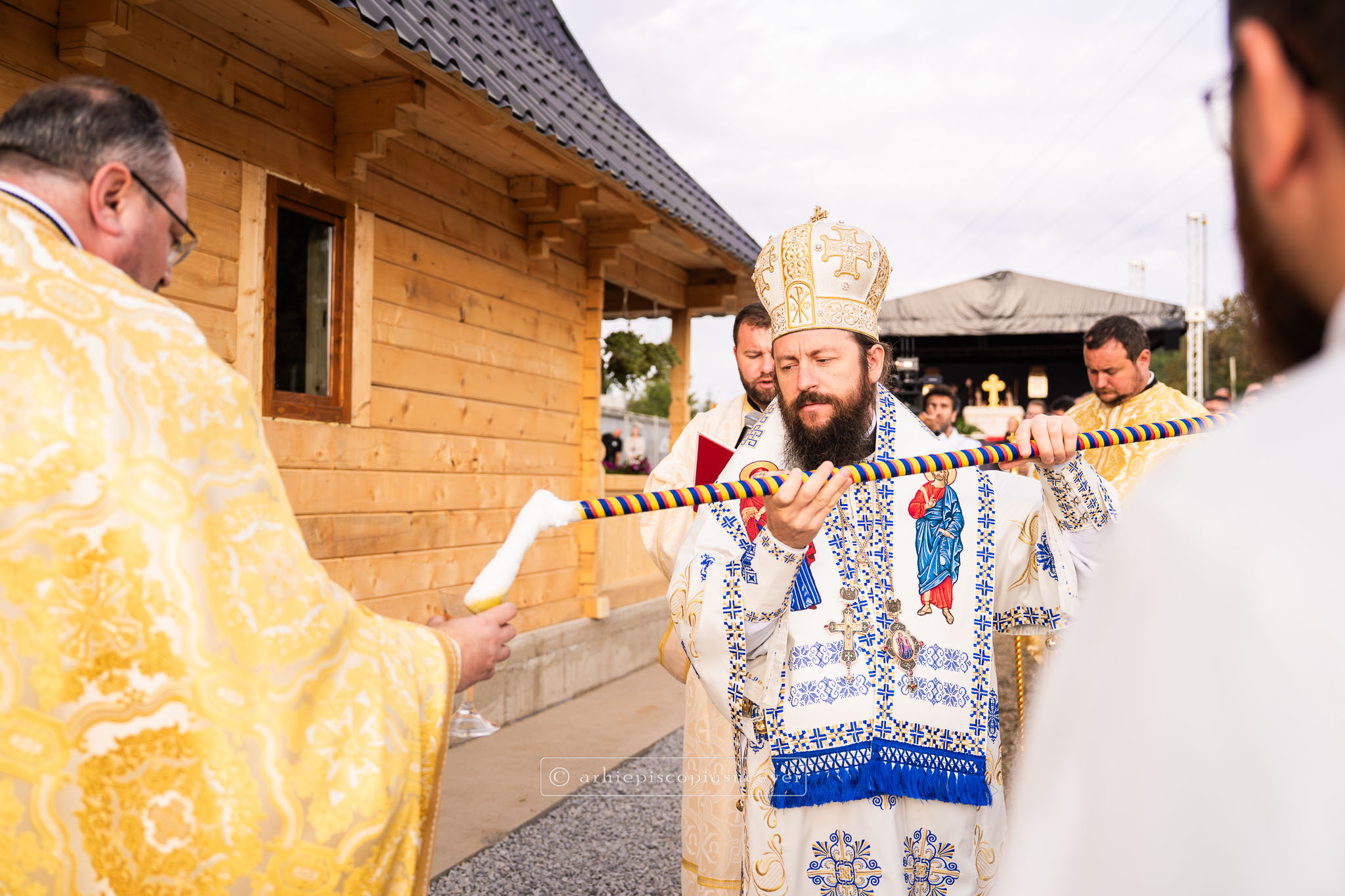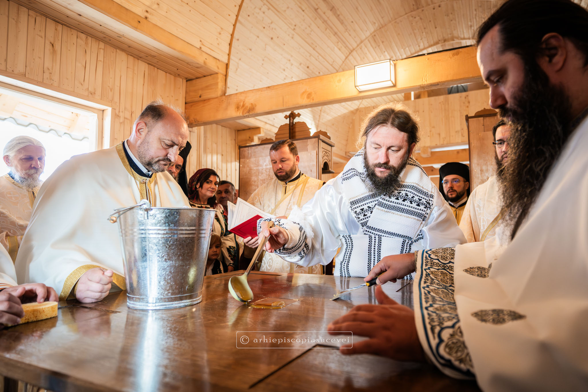Slujba de târnosire a început cu invocarea harului Preasfintei Treimi în fața ușilor închise ale bisericuței din lemn, aceasta fiind mai apoi înconjurată de soborul slujitor, făcându-se trei opriri, pentru a o binecuvânta prin stropire cu apă sfințită și prin însemnarea în chipul Sfintei Cruci cu Sfântul și Marele Mir. Preasfinția Sa a pecetluit apoi masa Sfântului Altar și a sfințit interiorul bisericii, potrivit rânduielilor liturgice.
