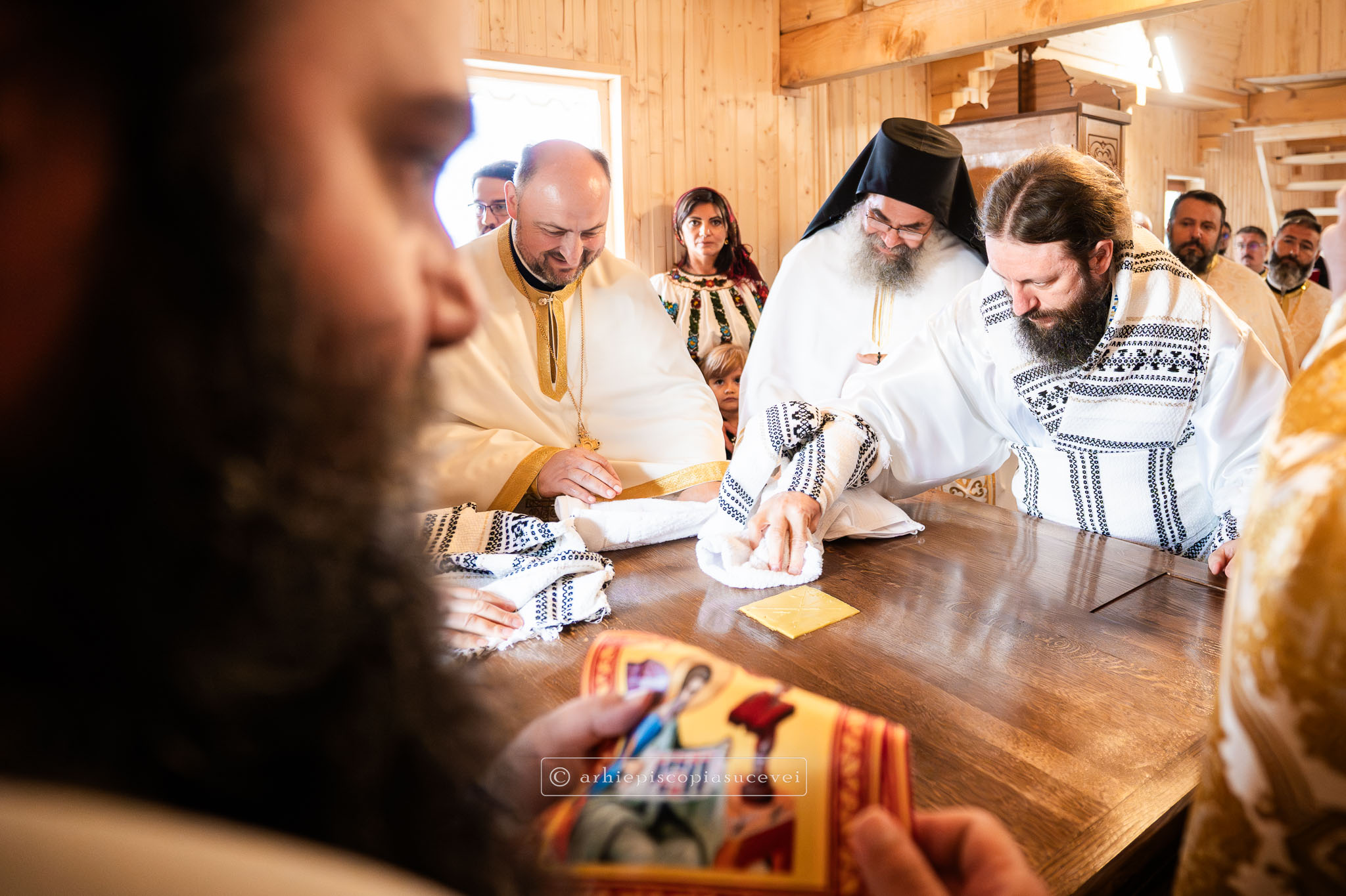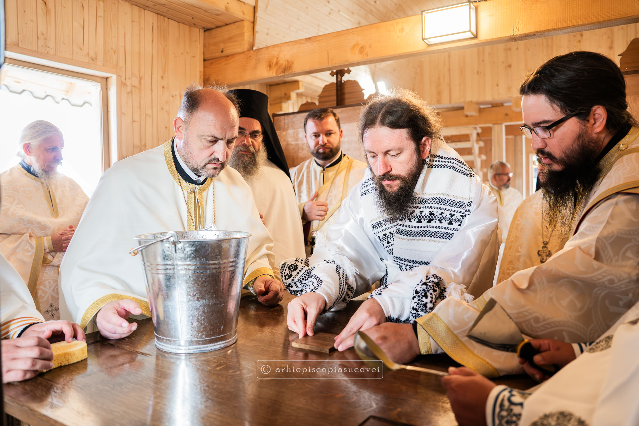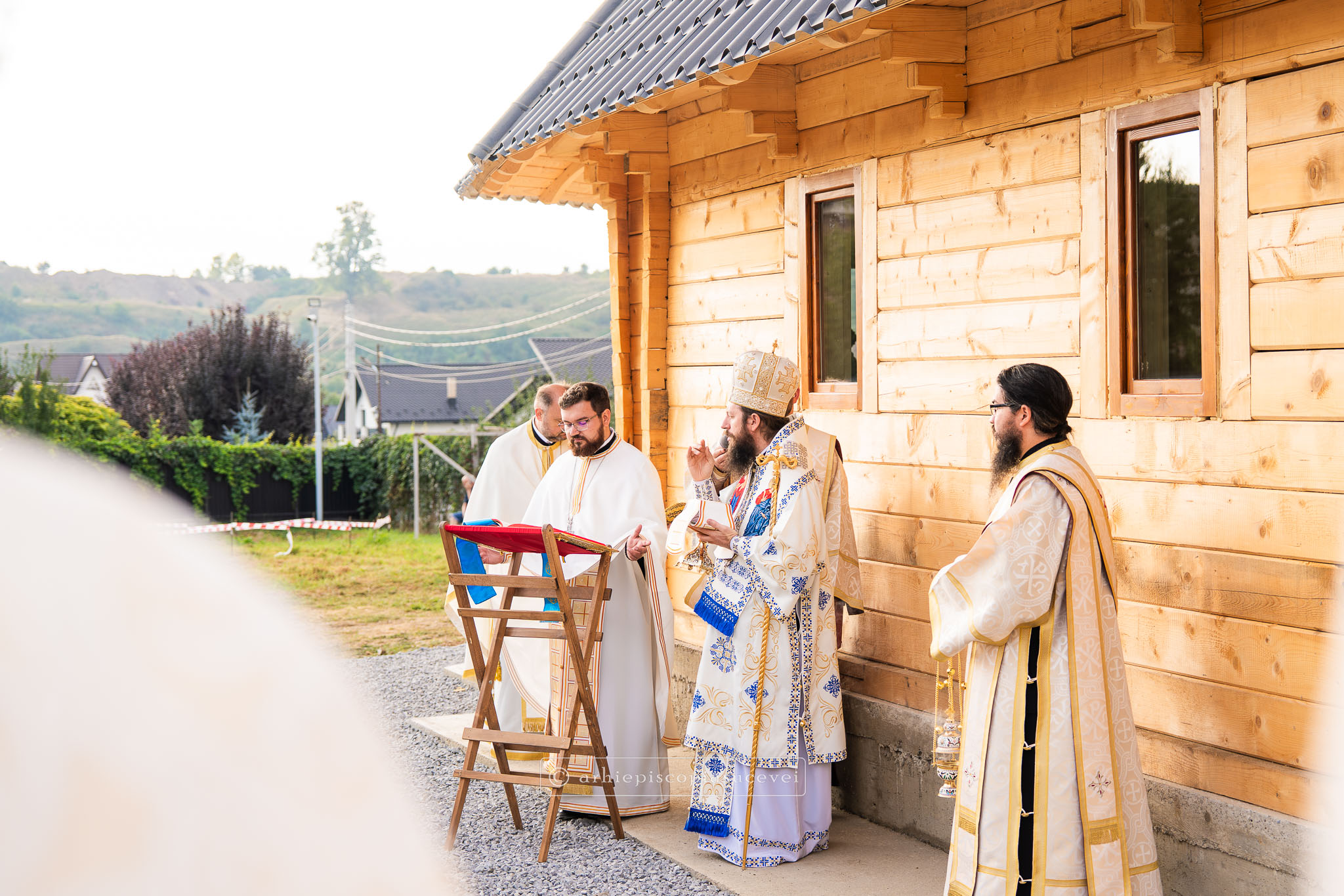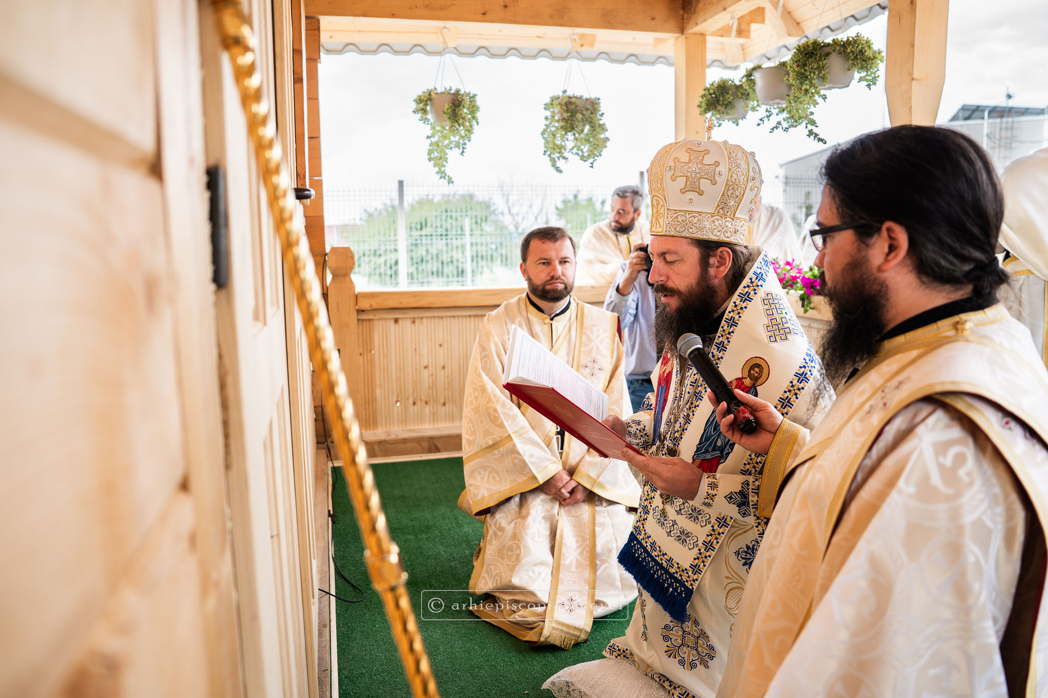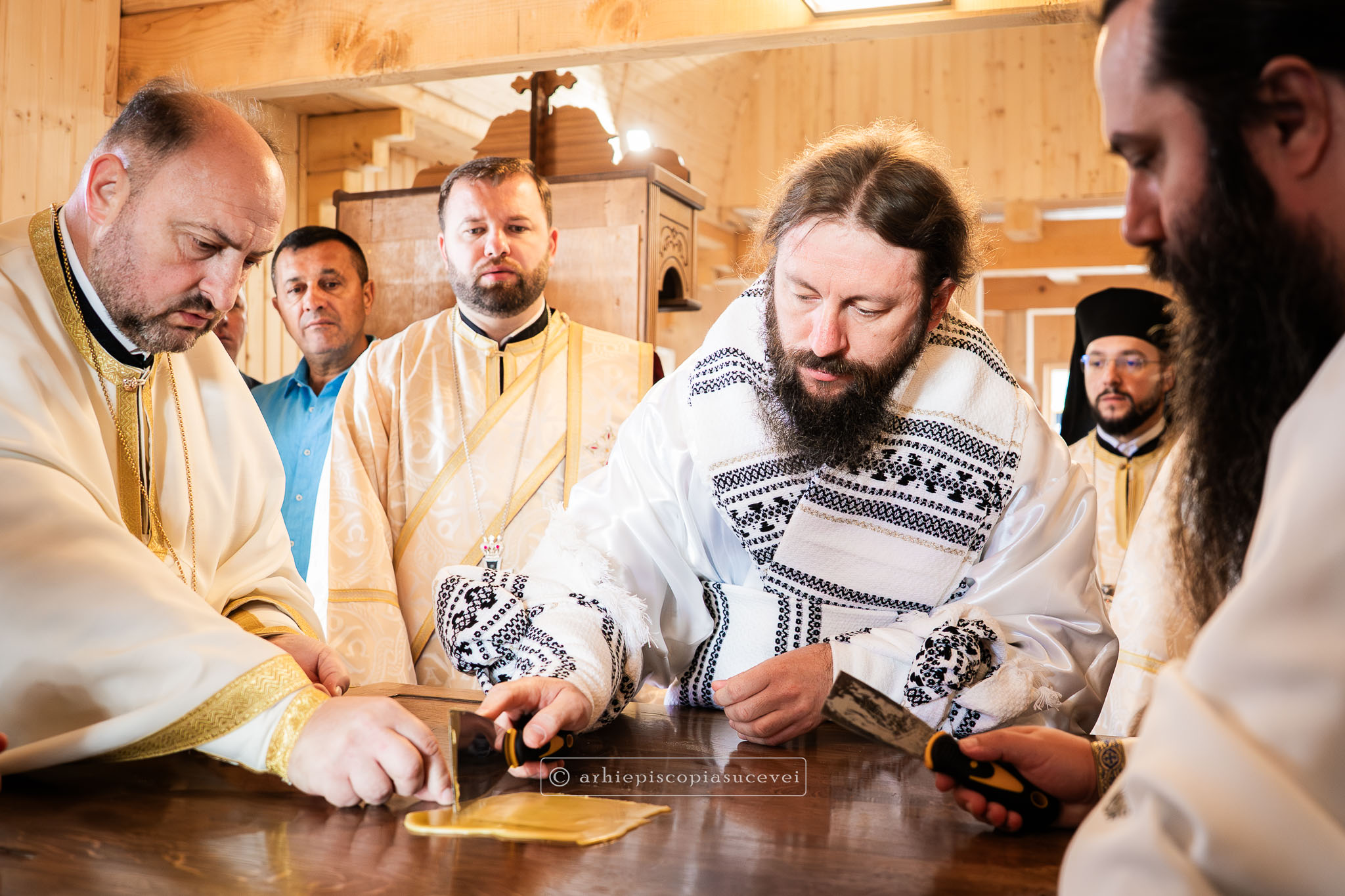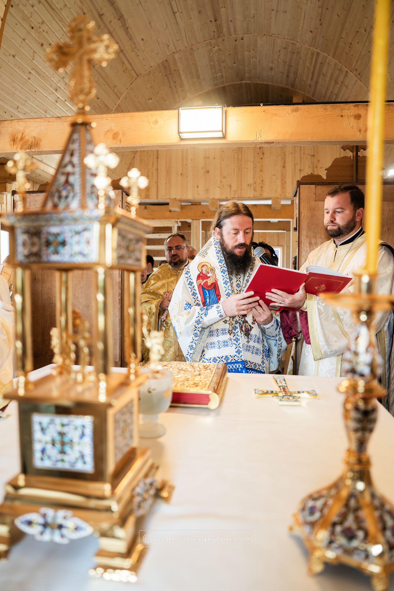 Slujba de târnosire a început cu invocarea harului Preasfintei Treimi în fața ușilor închise ale bisericuței din lemn, aceasta fiind mai apoi înconjurată de soborul slujitor, făcându-se trei opriri, pentru a o binecuvânta prin stropire cu apă sfințită și prin însemnarea în chipul Sfintei Cruci cu Sfântul și Marele Mir. Preasfinția Sa a pecetluit apoi masa Sfântului Altar și a sfințit interiorul bisericii, potrivit rânduielilor liturgice.