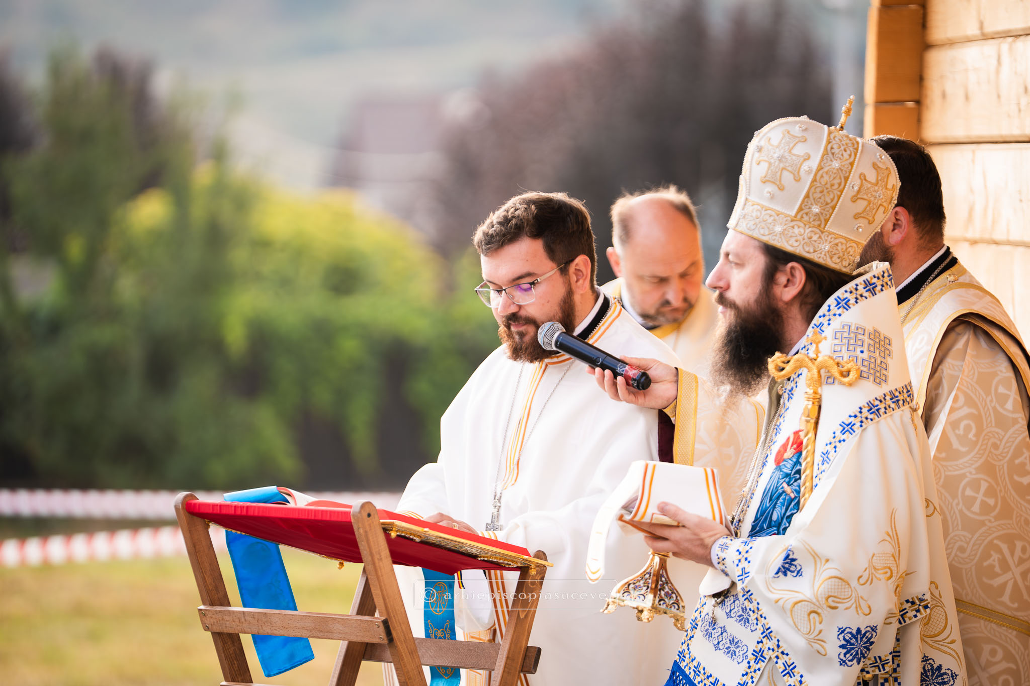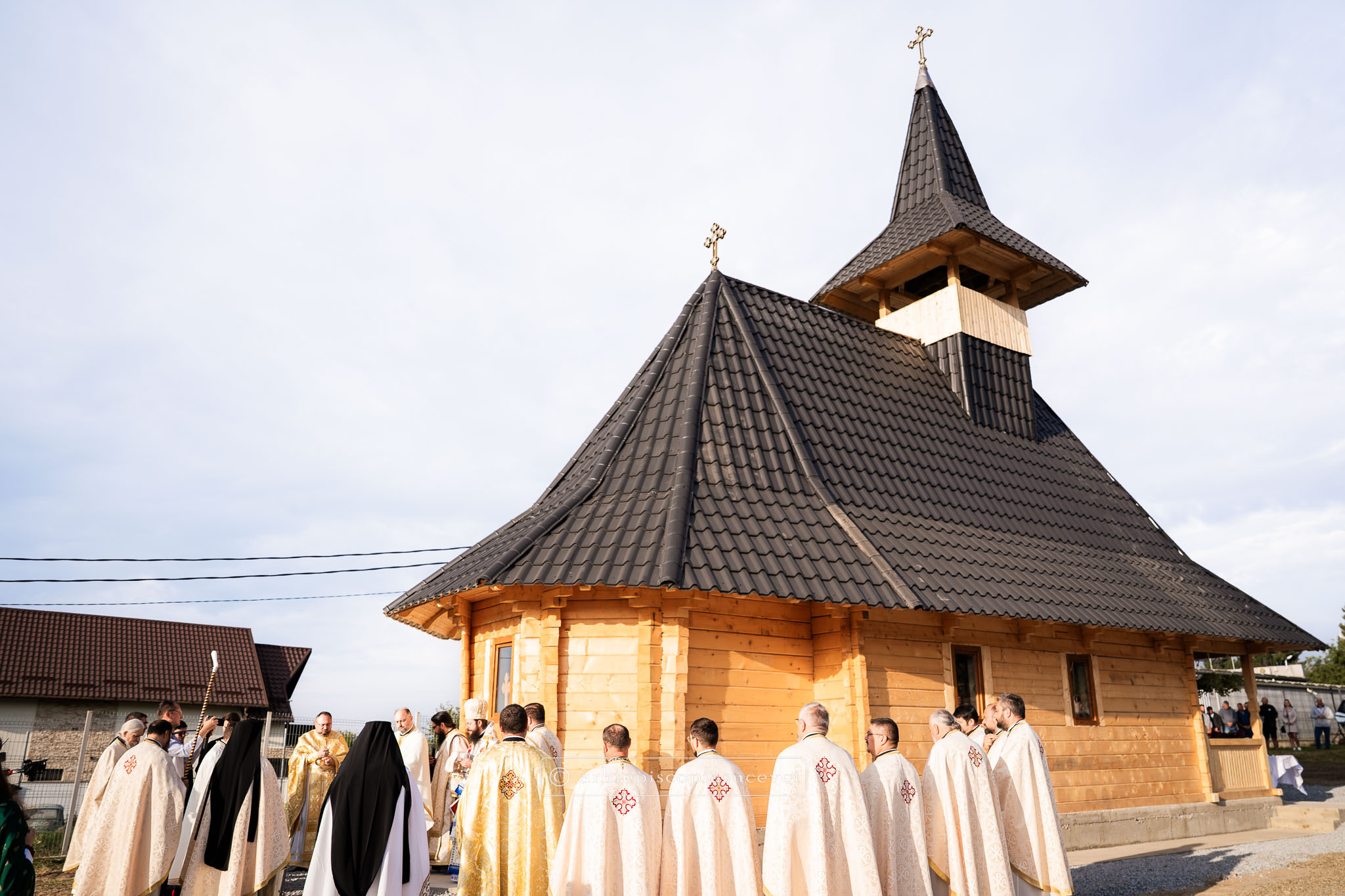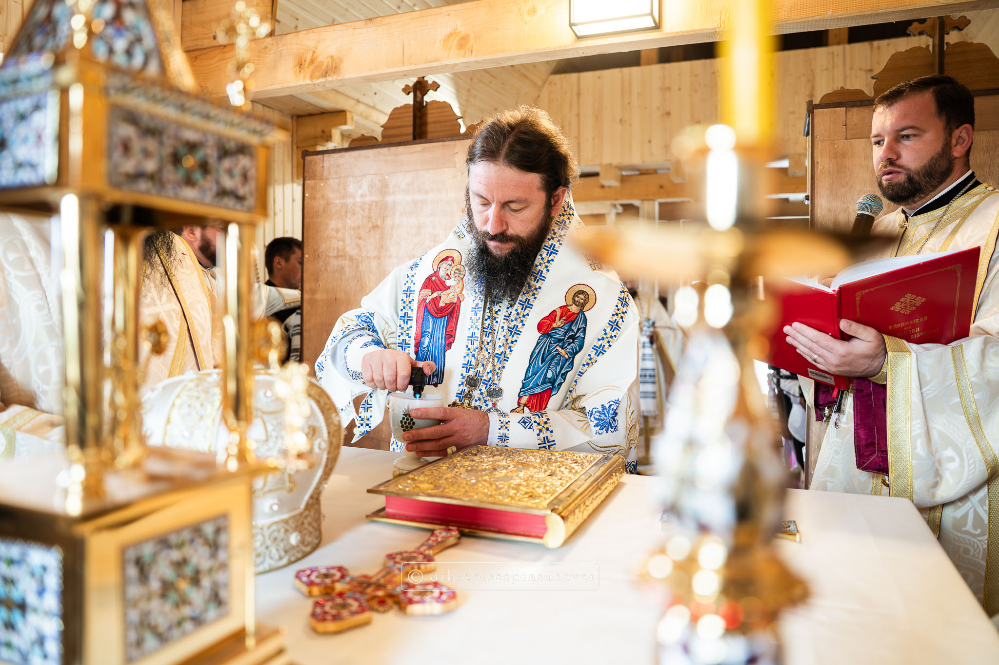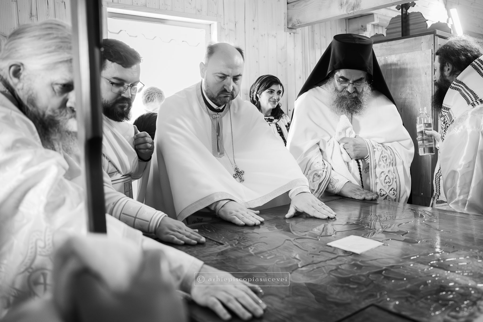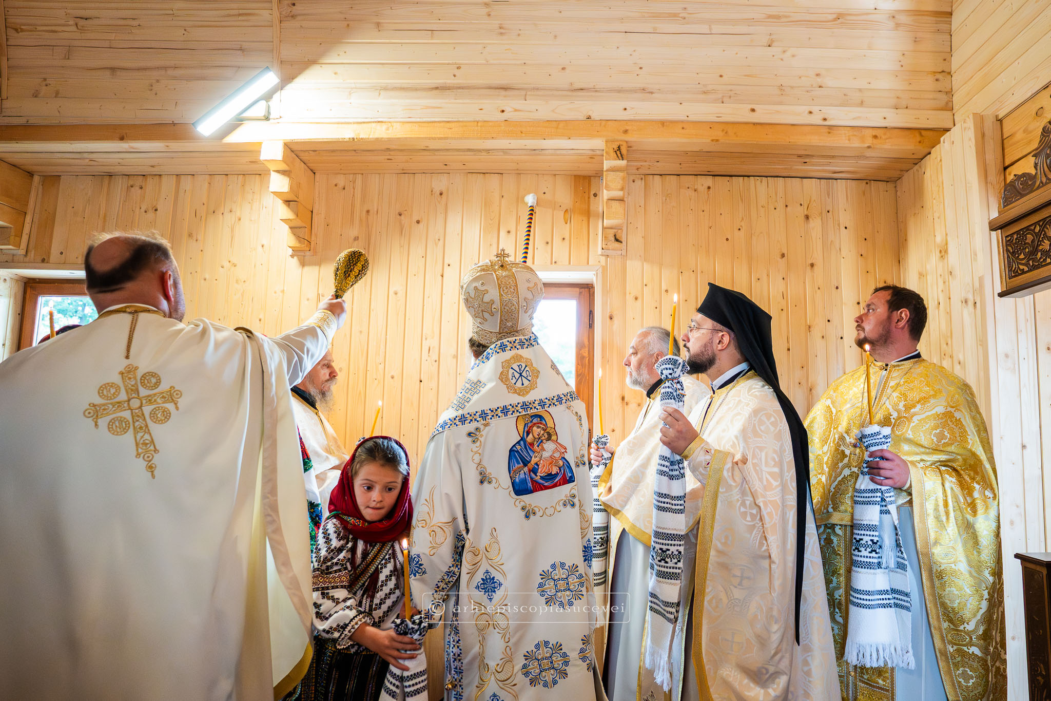 Slujba de târnosire a început cu invocarea harului Preasfintei Treimi în fața ușilor închise ale bisericuței din lemn, aceasta fiind mai apoi înconjurată de soborul slujitor, făcându-se trei opriri, pentru a o binecuvânta prin stropire cu apă sfințită și prin însemnarea în chipul Sfintei Cruci cu Sfântul și Marele Mir. Preasfinția Sa a pecetluit apoi masa Sfântului Altar și a sfințit interiorul bisericii, potrivit rânduielilor liturgice.
