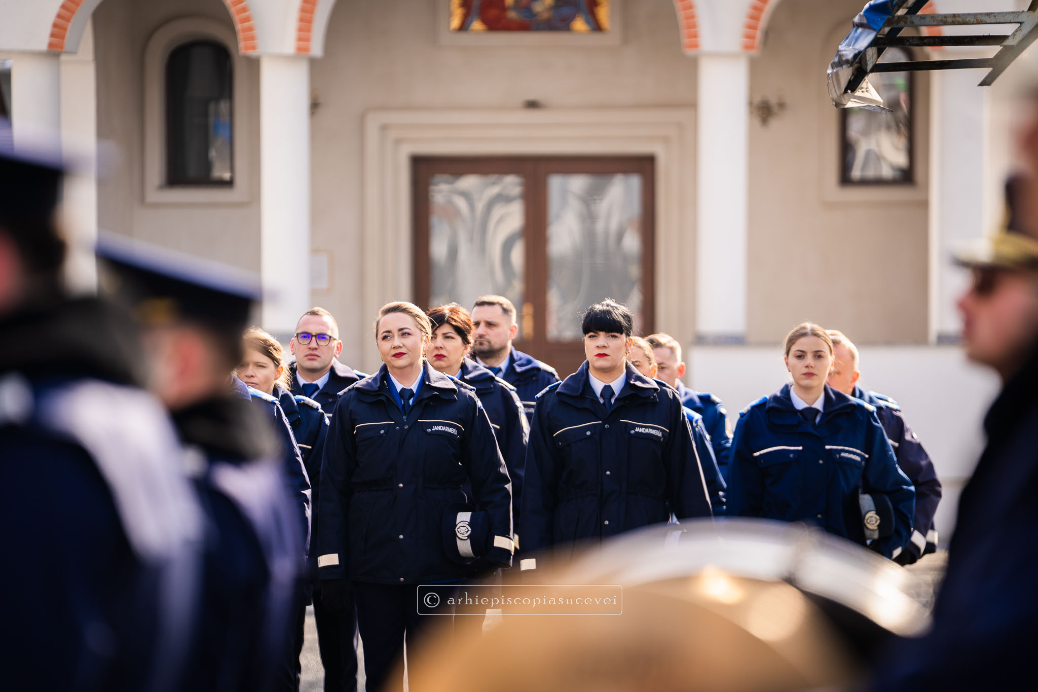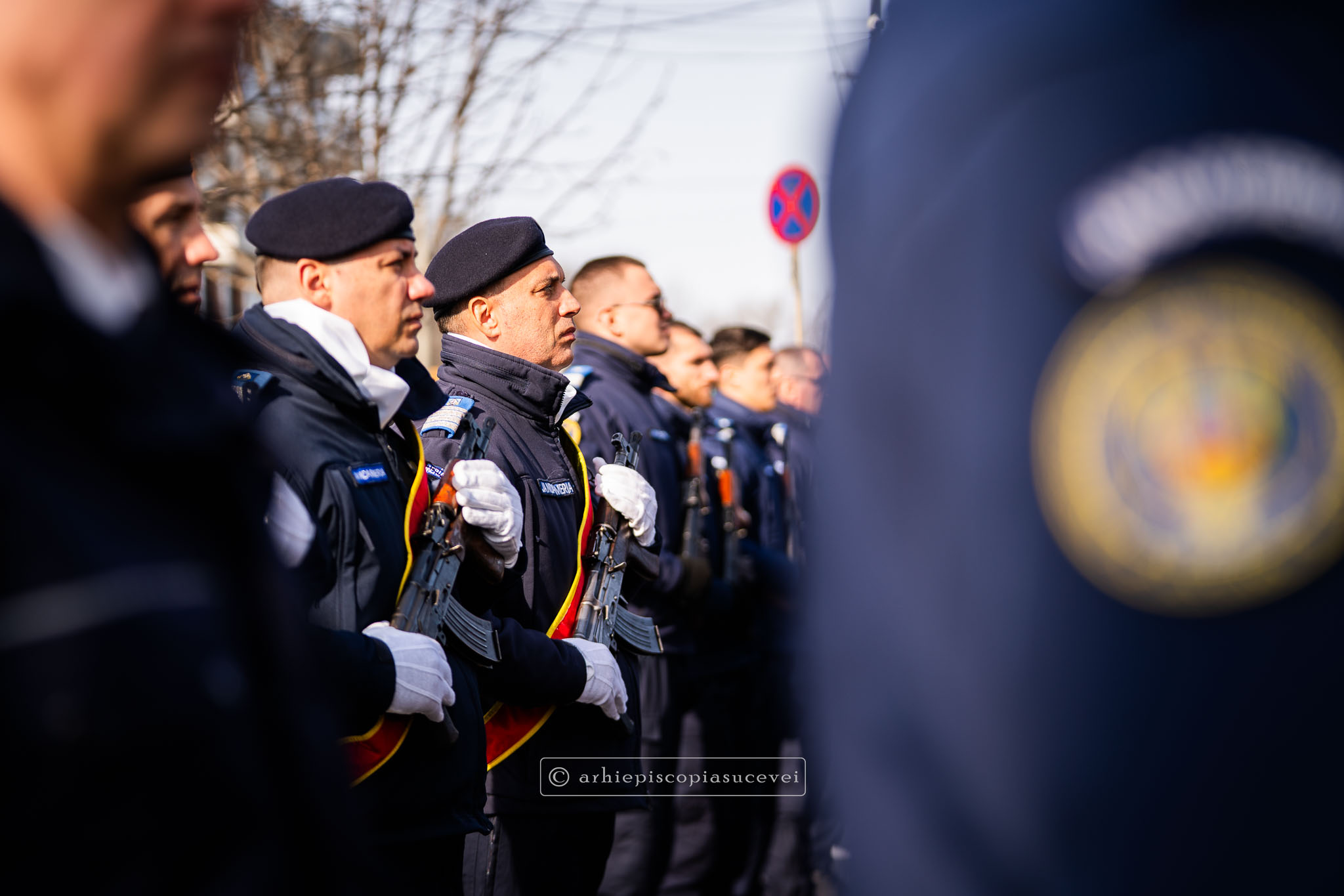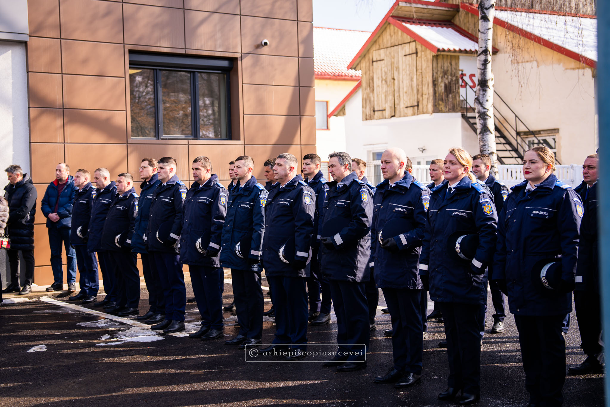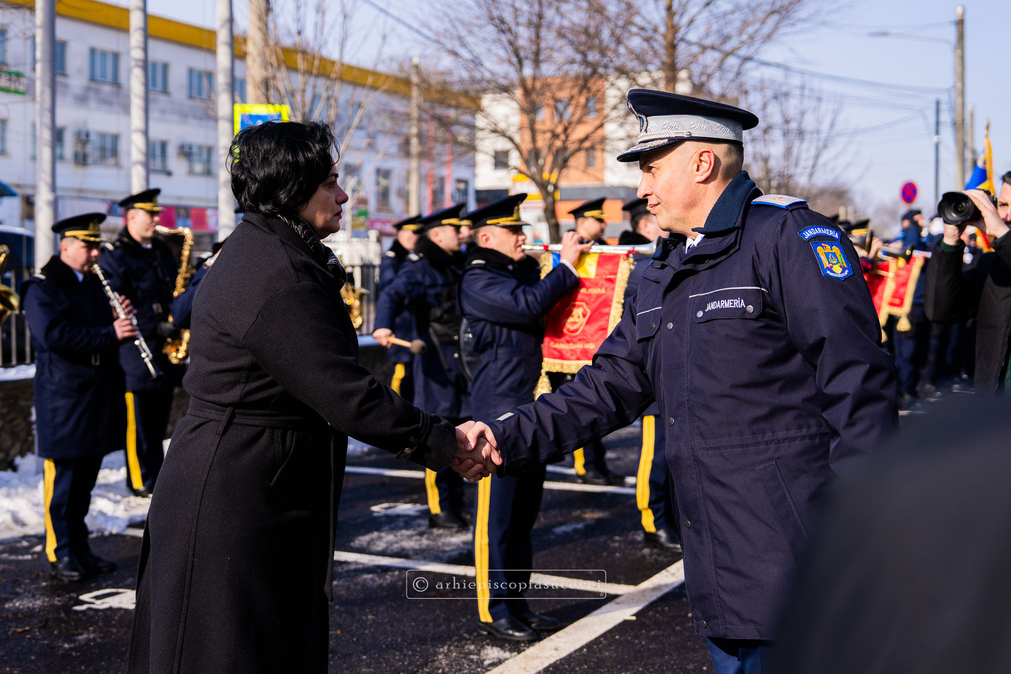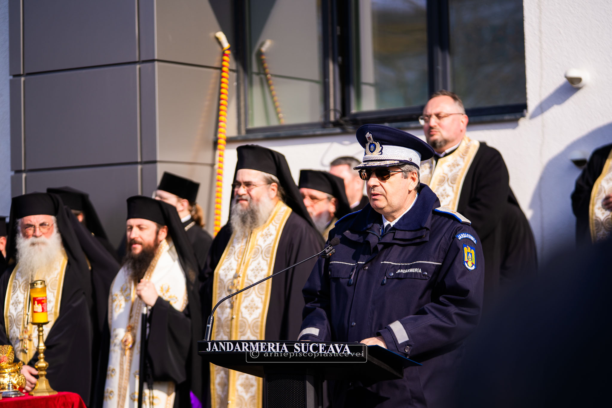Evenimentul a debutat cu intonarea Imnului Național al României de către Fanfara Militară a Garnizoanei Iași, Brigada 15 Mecanizată „Podu Înalt”, în prezența delegaților Arhiepiscopiei Sucevei și Rădăuților și a autorităților naționale și județene, între care doamna Angelica Fădor, Secretar de Stat în cadrul Ministerului Afacerilor Interne, Generalul de brigadă Lucian Trășcălie, Adjunct al Inspectorului General al Jandarmeriei Române, Traian Andronachi, Prefectul Județului Suceava, Stelian Simerea, Vicepreședintele Consiliului Județean Suceava. Alături de reprezentanții structurilor Inspectoratului de Jandarmi Județean din cuprinsul județului, la eveniment au luat parte și conducătorii structurilor Ministerului Apărării Naționale Suceava și ale Ministerului Afacerilor Interne.