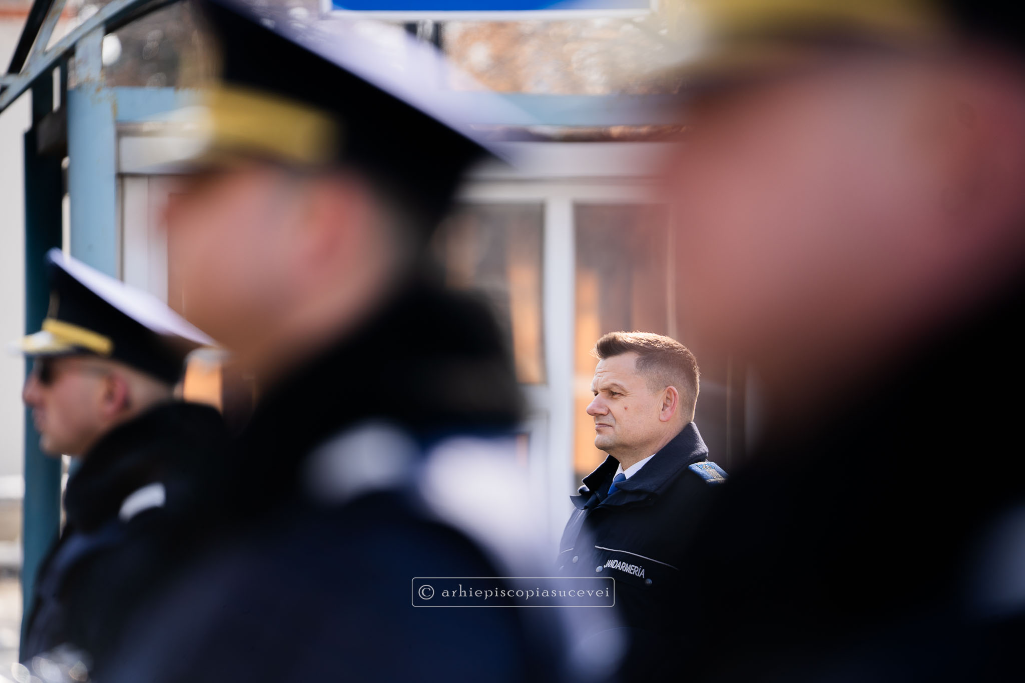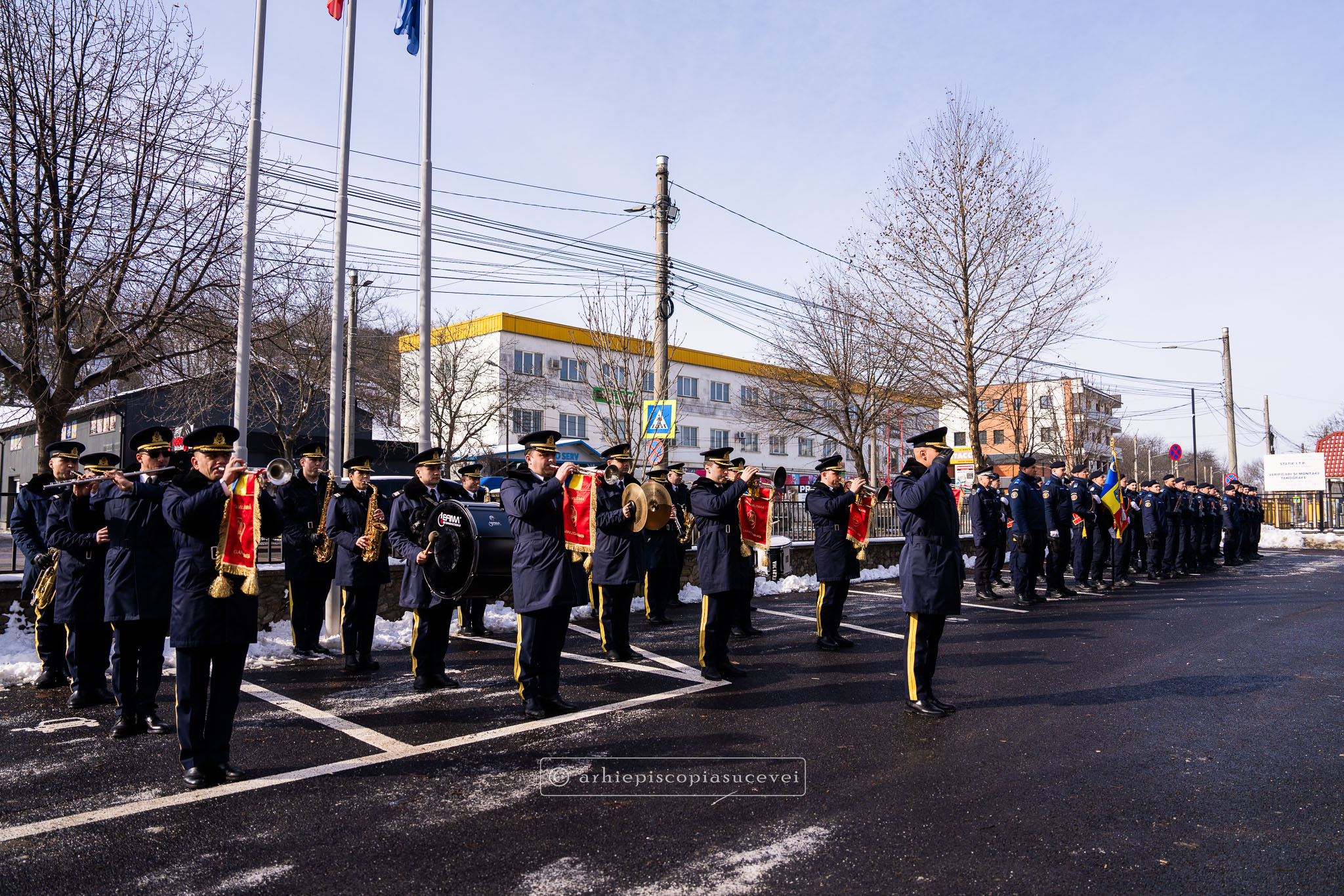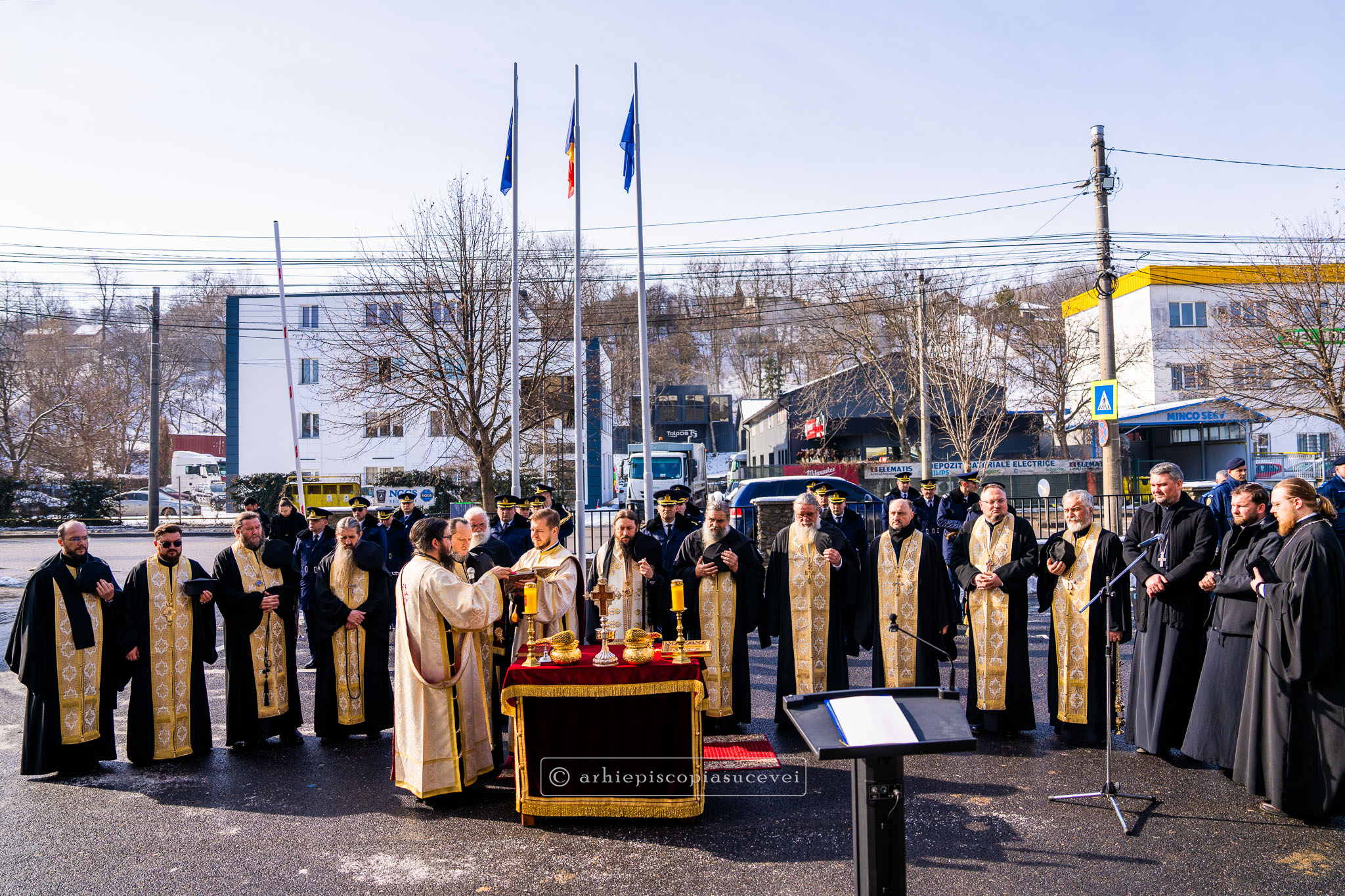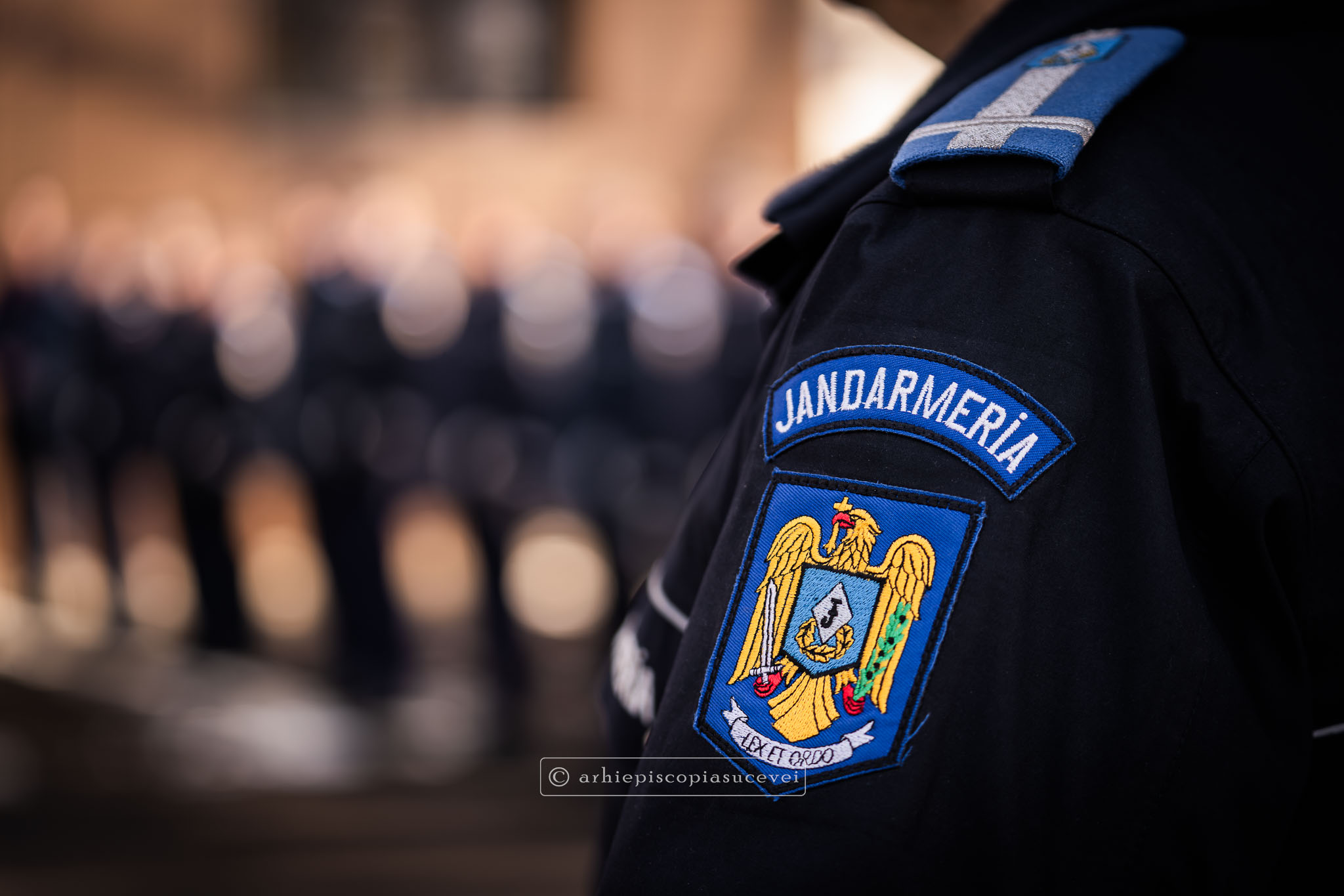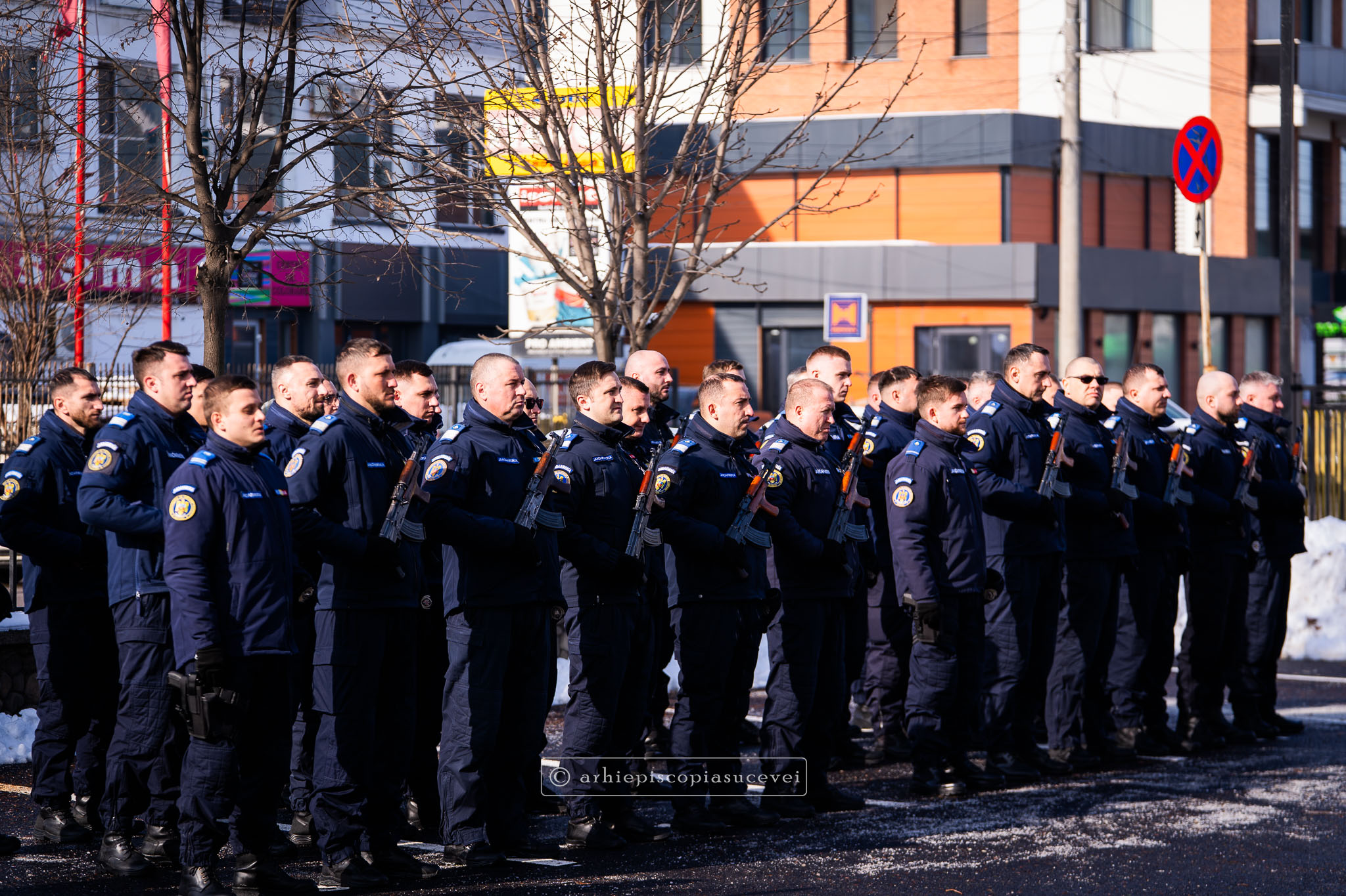 Evenimentul a debutat cu intonarea Imnului Național al României de către Fanfara Militară a Garnizoanei Iași, Brigada 15 Mecanizată „Podu Înalt”, în prezența delegaților Arhiepiscopiei Sucevei și Rădăuților și a autorităților naționale și județene, între care doamna Angelica Fădor, Secretar de Stat în cadrul Ministerului Afacerilor Interne, Generalul de brigadă Lucian Trășcălie, Adjunct al Inspectorului General al Jandarmeriei Române, Traian Andronachi, Prefectul Județului Suceava, Stelian Simerea, Vicepreședintele Consiliului Județean Suceava. Alături de reprezentanții structurilor Inspectoratului de Jandarmi Județean din cuprinsul județului, la eveniment au luat parte și conducătorii structurilor Ministerului Apărării Naționale Suceava și ale Ministerului Afacerilor Interne.