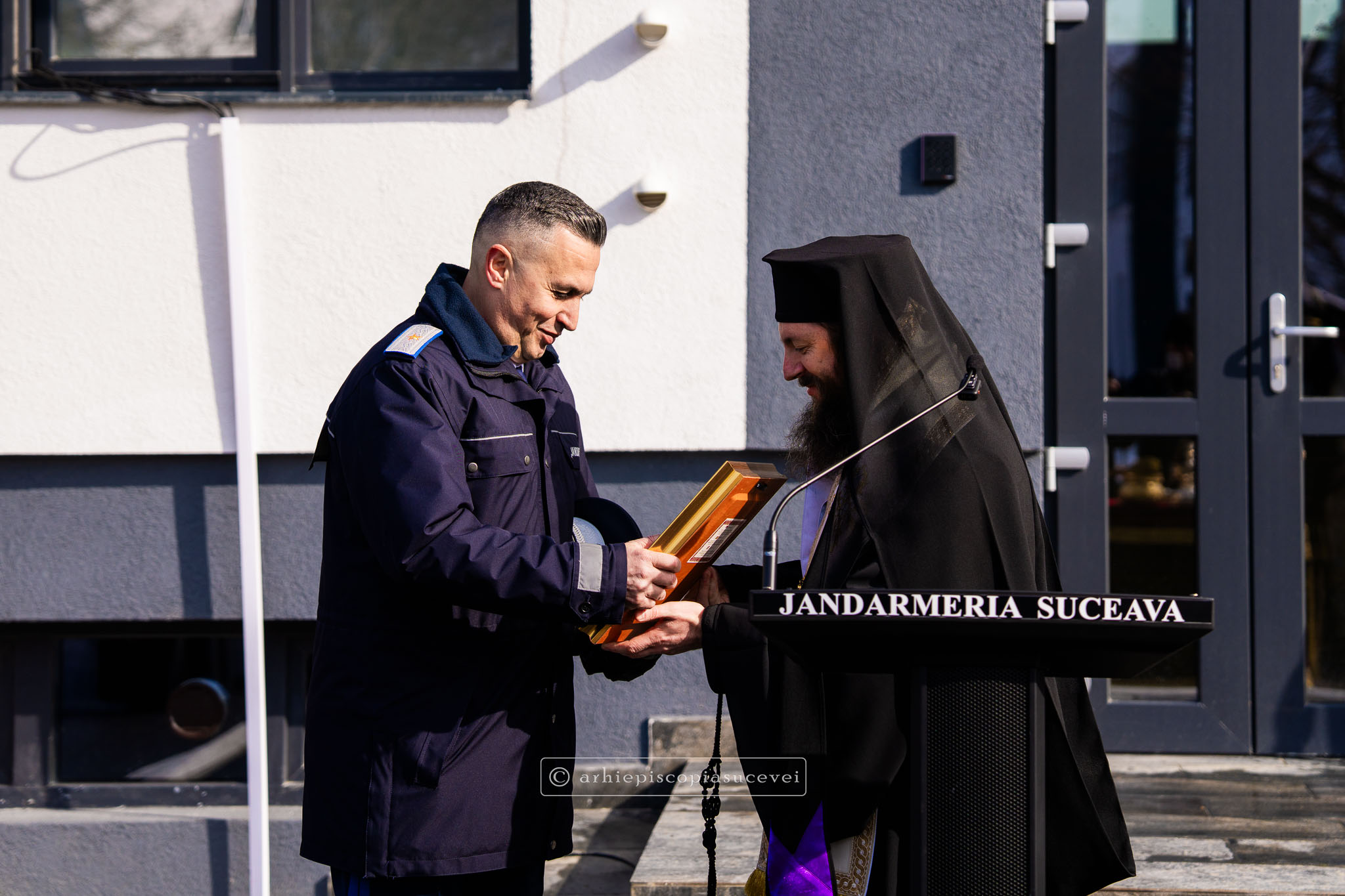 La ceas de sărbătoare pentru Inspectoratul de Jandarmi Județean „Bogdan-Vodă” Suceava, Preasfințitul Părinte Damaschin Dorneanul i-a oferit Generalului de Brigadă Ionel Postelnicu, Inspector șef al Inspectoratului de Jandarmi Județean „Bogdan-Vodă” din Municipiul Suceava, din partea Înaltpreasfinției Sale, o icoană cu Sfântul Mare Mucenic Ioan cel Nou de la Suceava, ocrotitorul întregii eparhii.