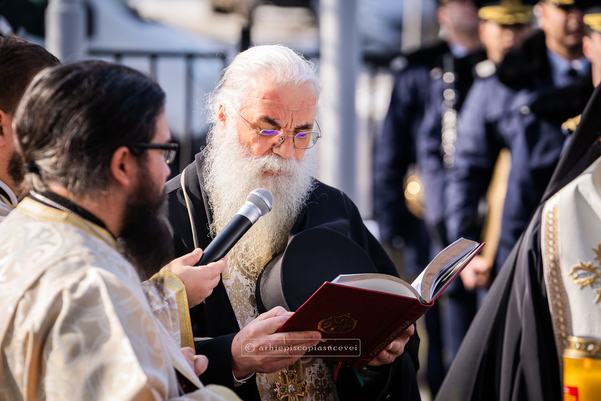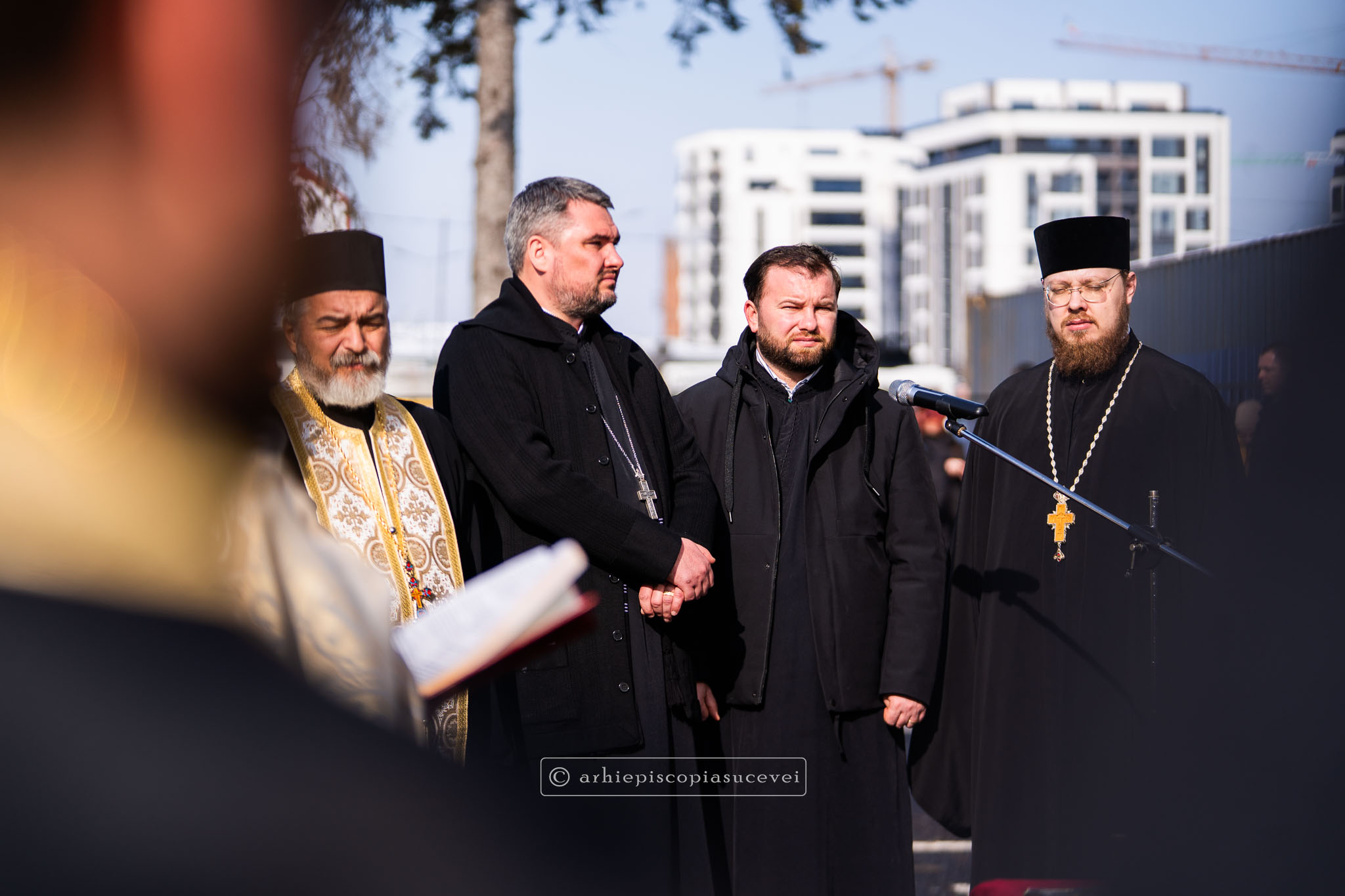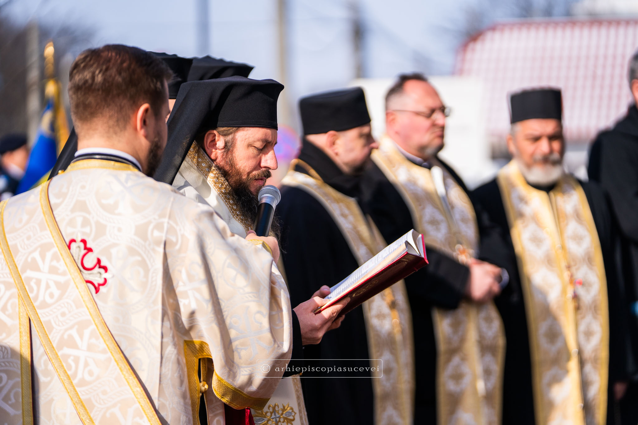 A urmat slujba de binecuvântare a sediului, care a beneficiat în ultimii trei ani de un amplu program de modernizare și reabilitare energetică, săvârșită de un sobor de clerici condus de Preasfințitul Părinte Damaschin Dorneanul, Episcop-Vicar al Arhiepiscopiei Sucevei și Rădăuților. Din soborul slujitor au făcut parte arhim. Melchisedec Velnic, exarh al mănăstirilor, arhim. Serafim Grigoraș și arhim. Mihail Balan, exarhi de zonă, consilieri ai Centrului Eparhial Suceava, între care pr. Andrei Mocanu, consilier al Sectorului Social-Filantropic, arhid. Paul Vlăduț Lungu, consilier al Sectorului Catehizare, Tineret și Educație pentru Viață, stareți ai așezămintelor monahale bucovinene și ostenitori ai administrației eparhiale.