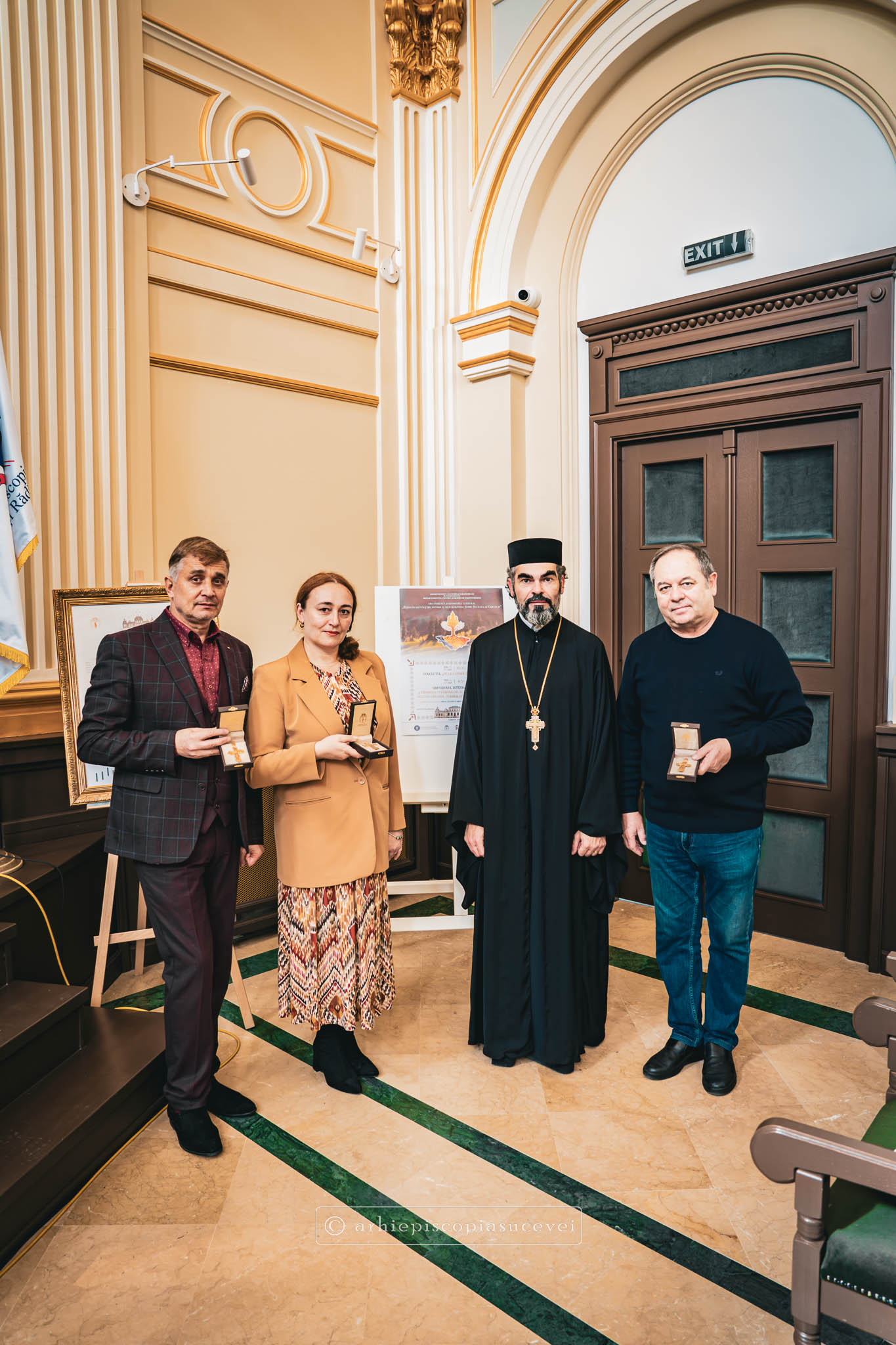 În continuare, au fost înmânate din partea chiriarhului locului mai multe distincții de vrednicie celor care au susținut și s-au implicat în lucrarea Bisericii de-a lungul timpului. Ordinul „Crucea Bucovinei”, cea mai înaltă distincție a eparhiei, a fost înmânată domnului prof. Iurie Levcic, președintele Centrului Bucovinean de Artă pentru Conservarea și Promovarea Culturii Tradiționale Românești de la Cernăuți, și domnului Nicolae Hacman, artist emerit al Ucrainei, pentru „remarcabila activitate dedicată Bisericii și Comunității”. Ordinul „Sfântul Mare Mucenic Ioan cel Nou de la Suceava” a fost oferit doamnei prof. Maria Calancea, președinta Asociației Centrul pentru Conservarea și Promovarea Culturii Tradiționale „Arboroasa”, întrucât a urmat exemplul „tânărului înțelepțit de Dumnezeu, care și-a îndeplinit cu devotament slujirea sa și și-a fundamentat credința ortodoxă pe înțelegerea Evangheliei, mărturisind-o curajos semenilor săi prin faptă și cuvânt”.