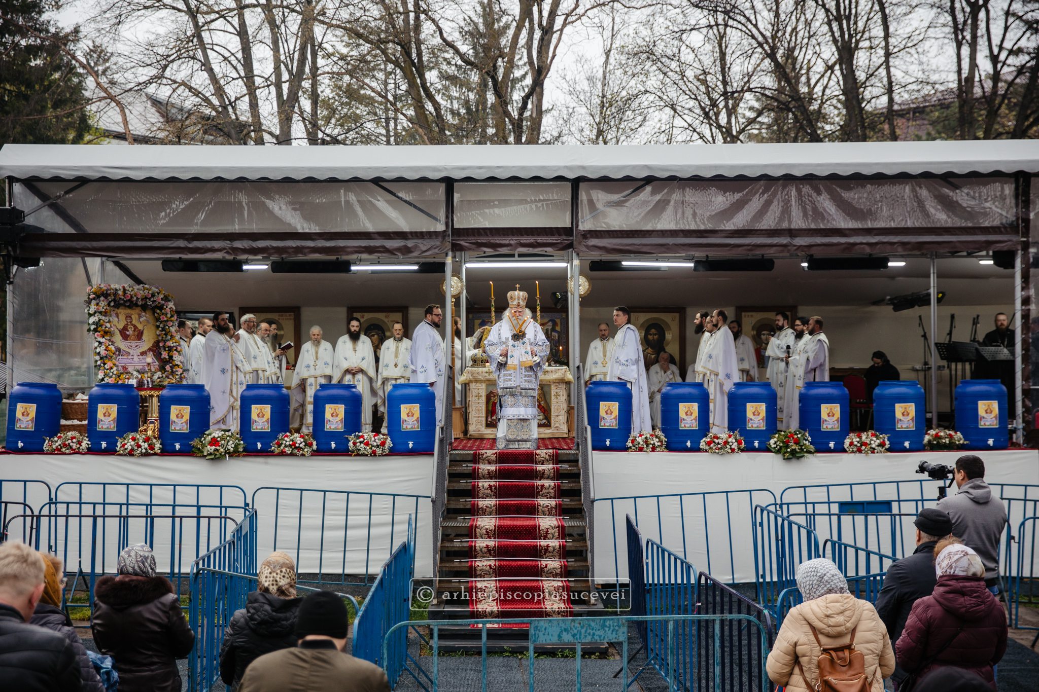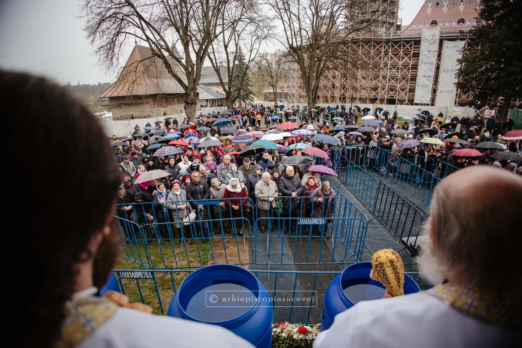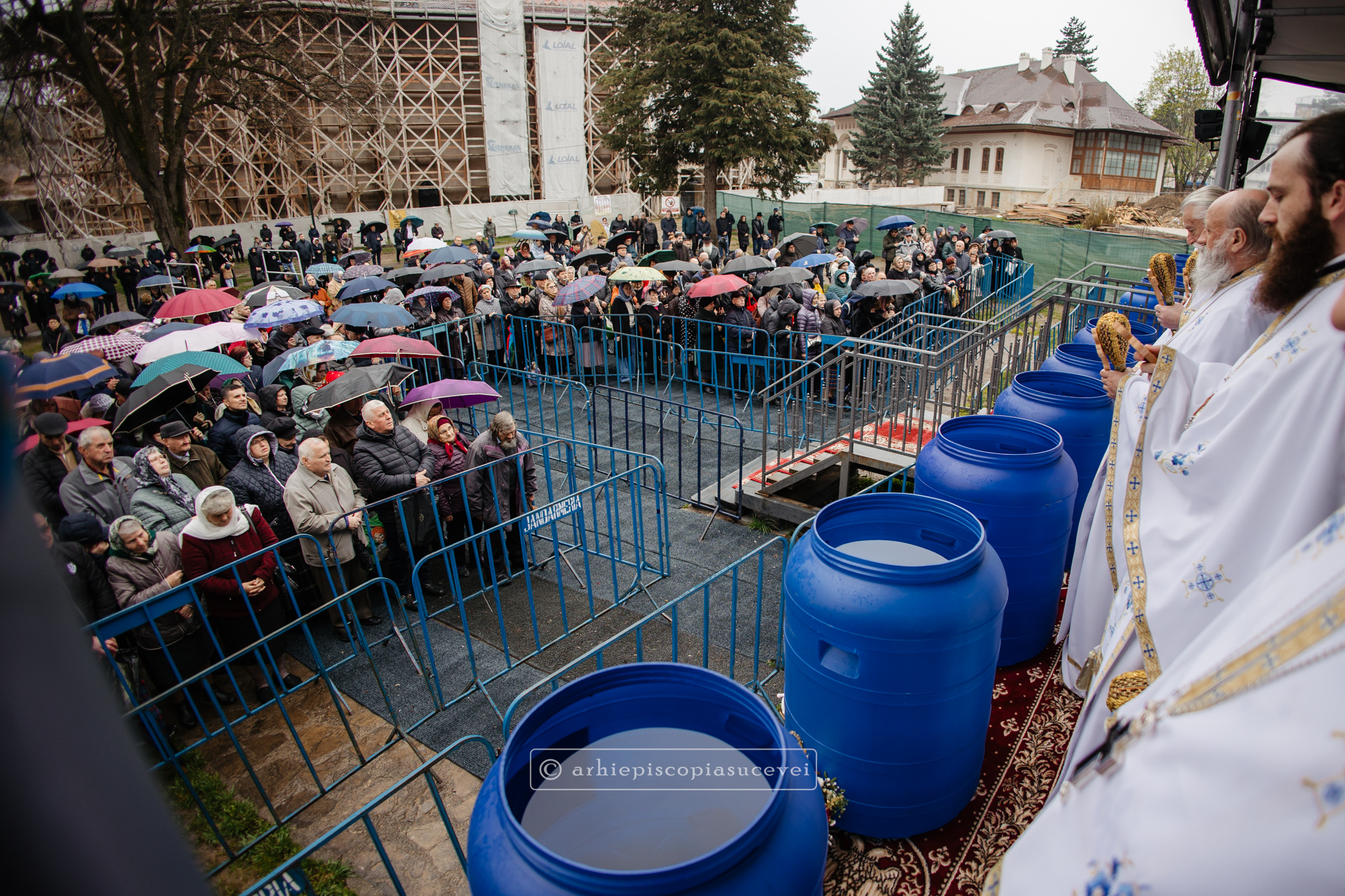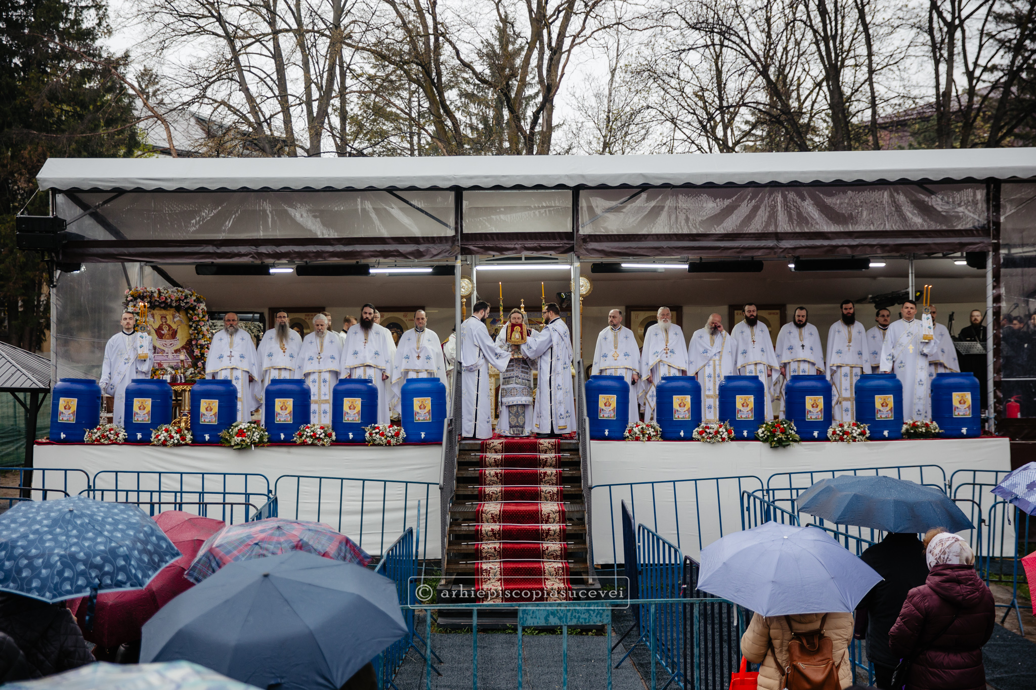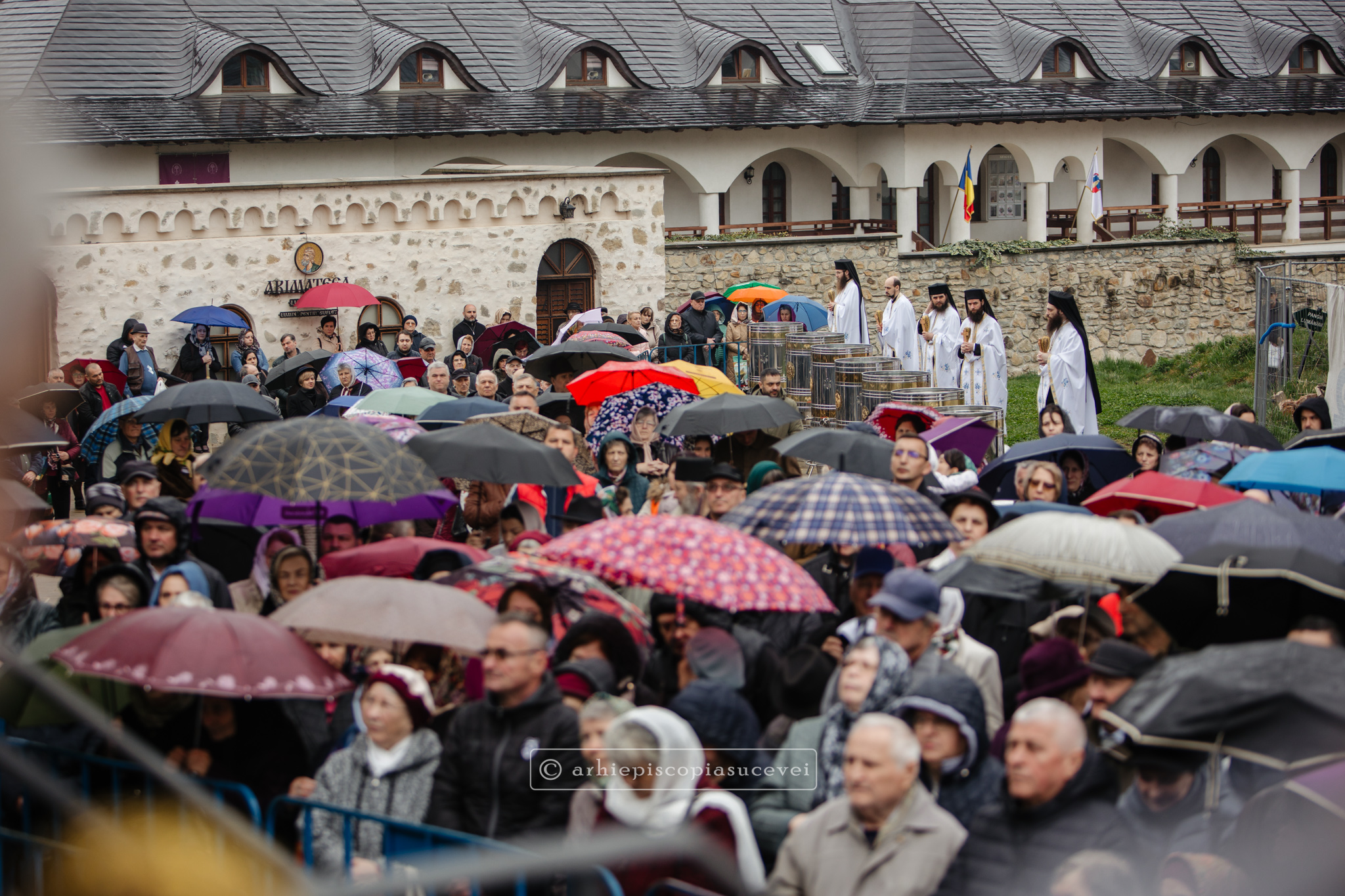 În Vinerea primei săptămâni după Sfintele Paști, când Biserica a rânduit prăznuirea Izvorului Tămăduirii, sărbătoare închinată Născătoarei de Dumnezeu, chivot sfințit al Celui mai presus de fire și icoană a Bisericii în care se dobândeşte vindecarea prin harul tămăduitor, dat ei de Capul Hristos, Cel răstignit şi înviat, Sfânta Liturghie a fost săvârșită de cei doi ierarhi ai eparhiei, Înaltpreasfințitul Părinte Calinic, Arhiepiscop al Sucevei și Rădăuților, și Preasfințitul Părinte Damaschin Dorneanul, Episcop-Vicar. În comuniune liturgică li s-a alăturat un sobor de preoți și diaconi ai Catedralei Arhiepiscopale, dar și clerici din cadrul Centrului Eparhial, sub protia părintelui arhimandrit Serafim Grigoraș, starețul mănăstirii ce adăpostește de peste cinci veacuri cinstitele moaște ale Sfântului Ioan cel Nou.