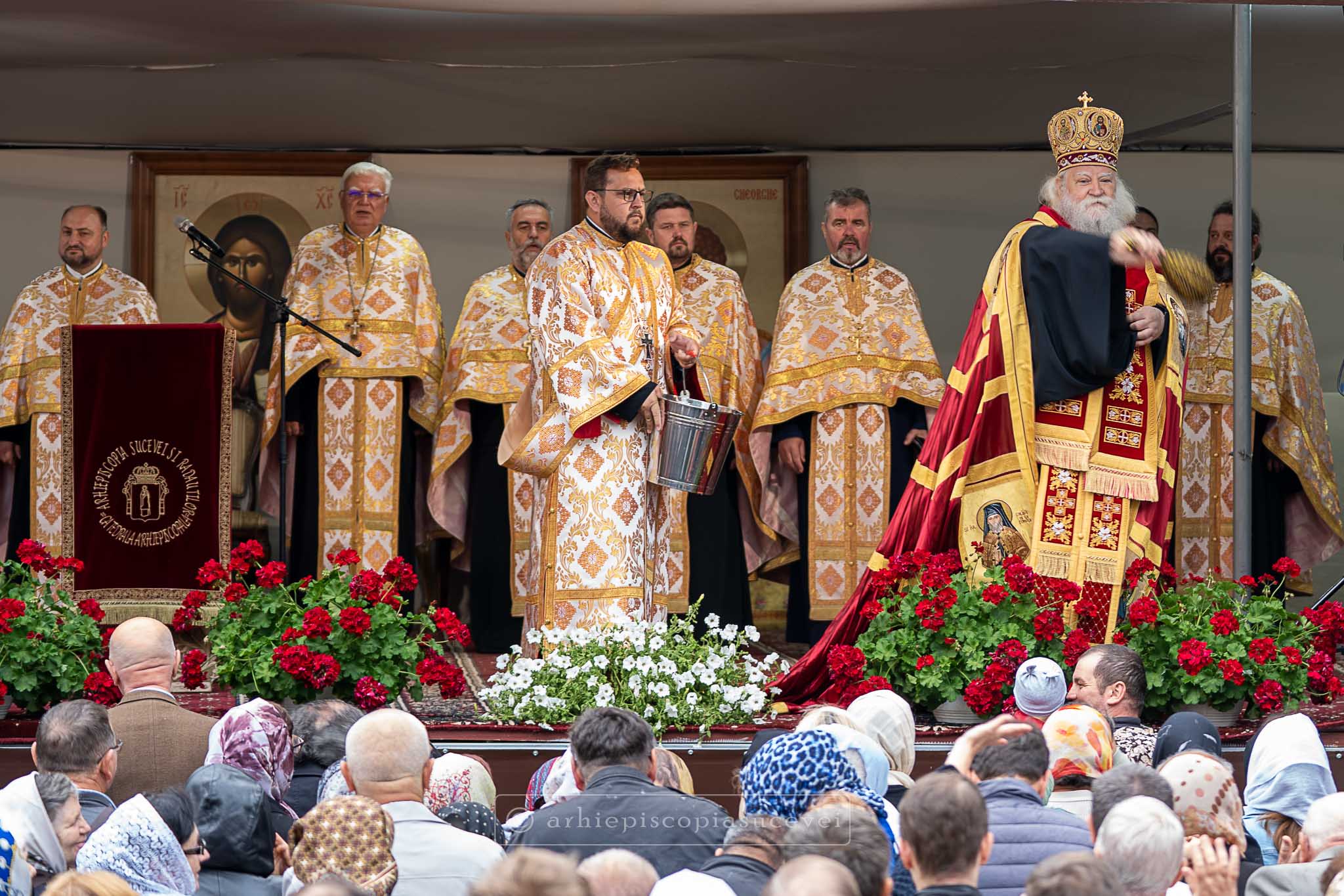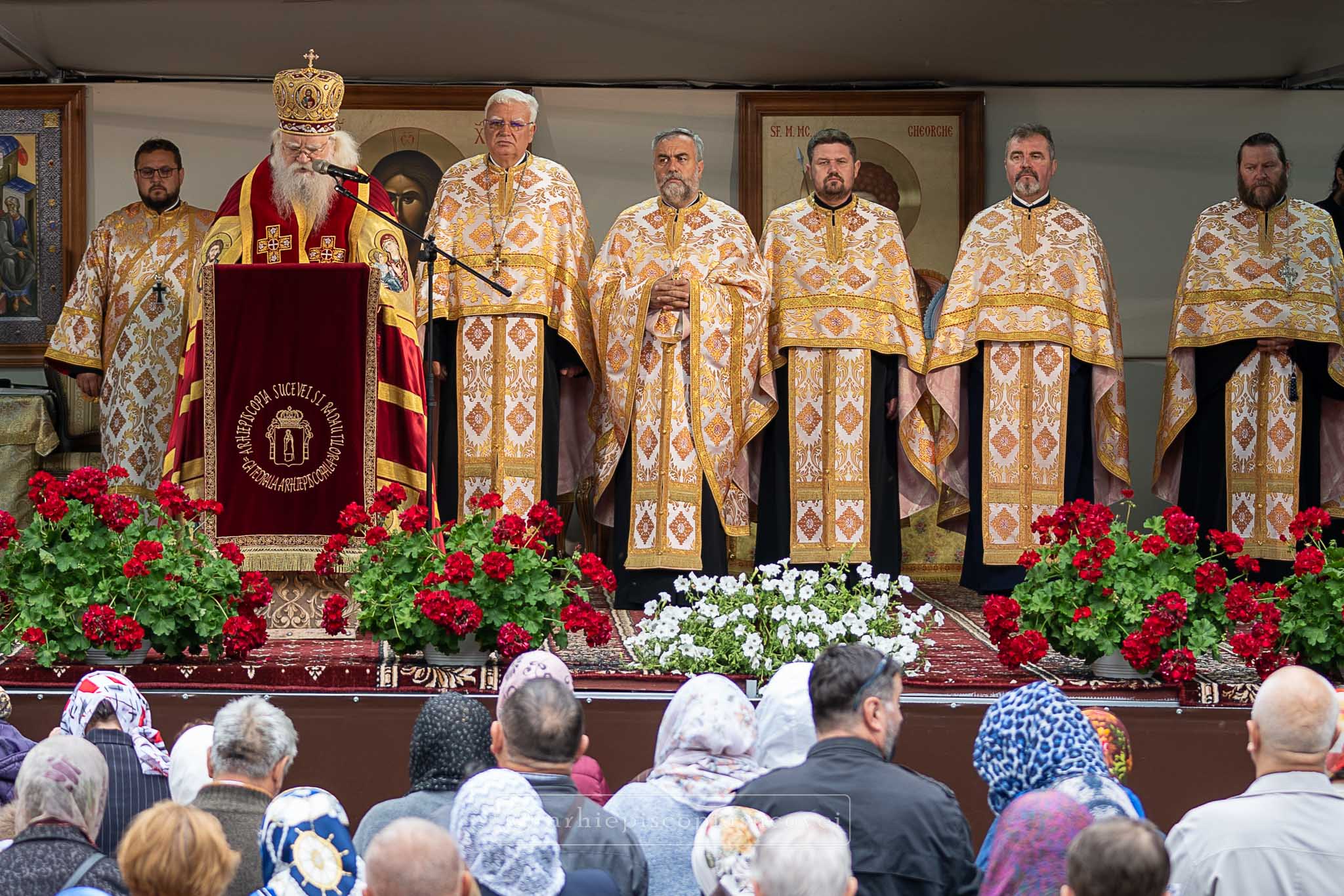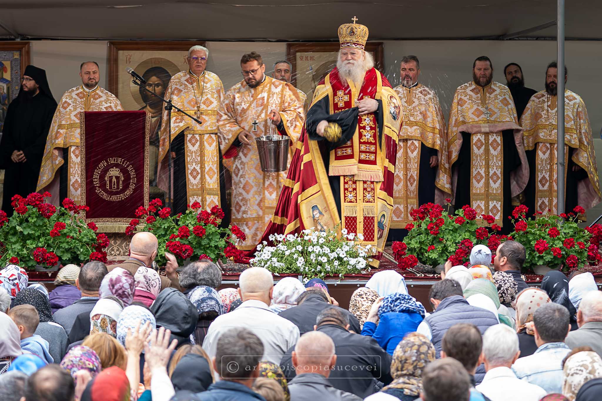 Credincioșii au fost binecuvântați prin stropire cu apă sfințită de către cei doi arhierei, iar la final, Înaltpreasfințitul Părinte Arhiepiscop Calinic le-a mulțumit tuturor celor care în zilele hramului au fost mărturii vii ale dragostei pentru Sfântul ocrotitor al Bucovinei.