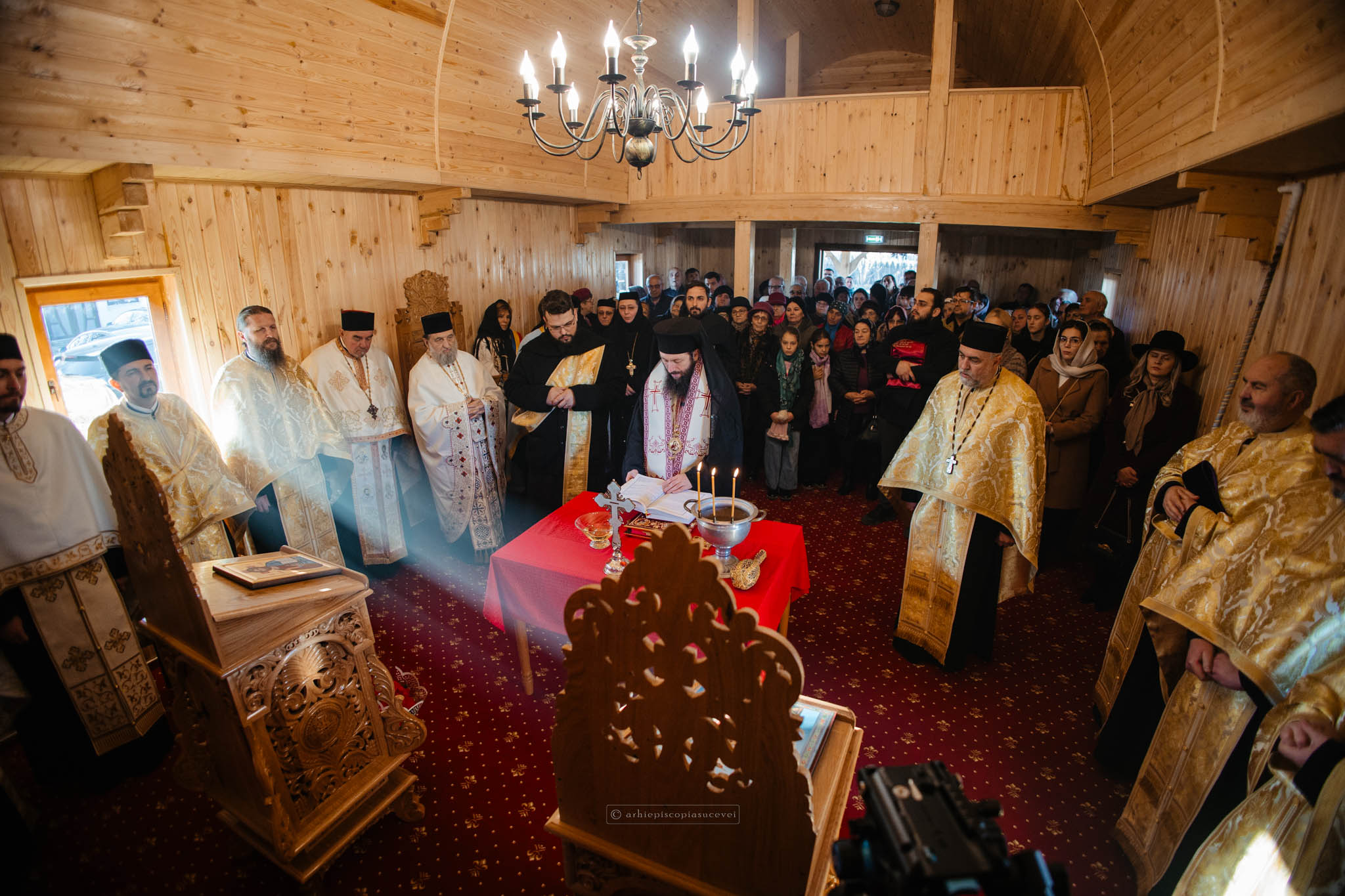 După ce a fost întâmpinat cu pâine și sare, potrivit tradiției, de către primarul localității, doamna Maria Tomescu, ierarhul, alături de un sobor de preoți și diaconi, a binecuvântat bisericuța din lemn prin ungere cu untdelemn sfințit și prin stropire cu agheasmă. Din soborul împreună slujitor au făcut parte pr. Andrei Mocanu, consilier eparhial al Sectorului de Asistență Socială și Medicală, arhim. Justinian Cârstoiu, de la Facultatea de Teologie Ortodoxă „Justinian Patriarhul” din București, pr. Adrian Dulgheriu, protoiereu al Protopopiatului Fălticeni, precum și clerici de la parohiile din apropiere.